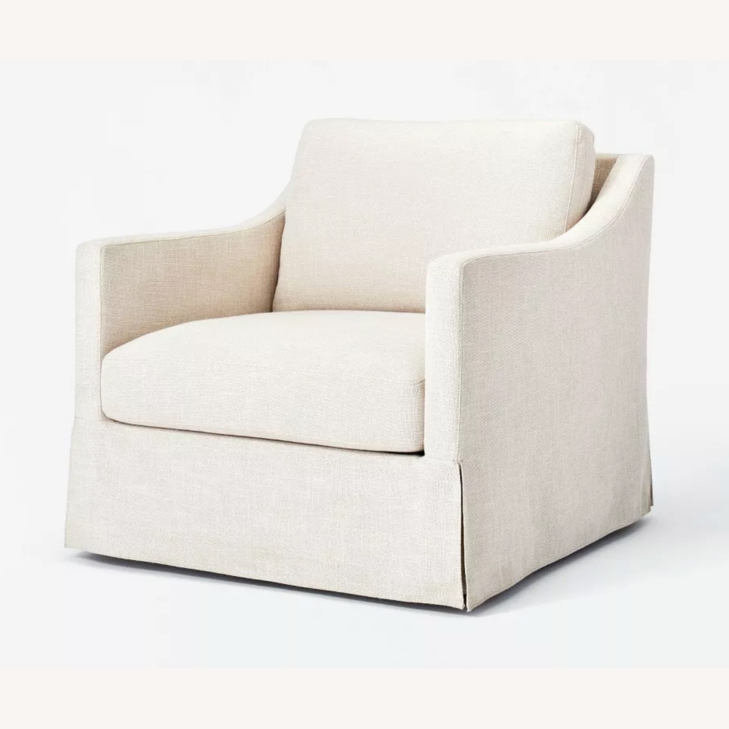 Seller's Notes:Highlights Upholstered swivel chair gives your space a finished look Coordinates well with an array of color palettes Armchair-style design creates a comfy seating experience Spot or wipe clean Description Give your living space a polished look when you add the Vivian Park Upholstered Swivel Chair from Threshold™ designed with Studio McGee. With its padded back, seat and armrests, this upholstered chair swivels for comfort and convenience. The frame is kept hidden by a slipcover that extends to the floor for a clean, polished look. Plus, it comes in a simple cream color that's easy to coordinate, looking just as good complementing furniture in other neutral hues as contrasting brighter, bolder colors. Meet Shea McGee, the designer and stylist behind the brand Studio McGee. Founded alongside her husband, Syd, the studio is known for Shea’s design of beautifully elevated spaces that encourage clients to surround themselves with the things and people they love. Now she’s partnering with Threshold to offer Studio McGee’s classic design in a new collection for inspired homes, everywhere. Overall width: 32.3 inches Overall height: 32 inches Overall depth: 36 inches Distance from floor to top of seat cushion: 17 inches Distance from floor to top of arm: 23.2 inches Seat depth: 22 inches