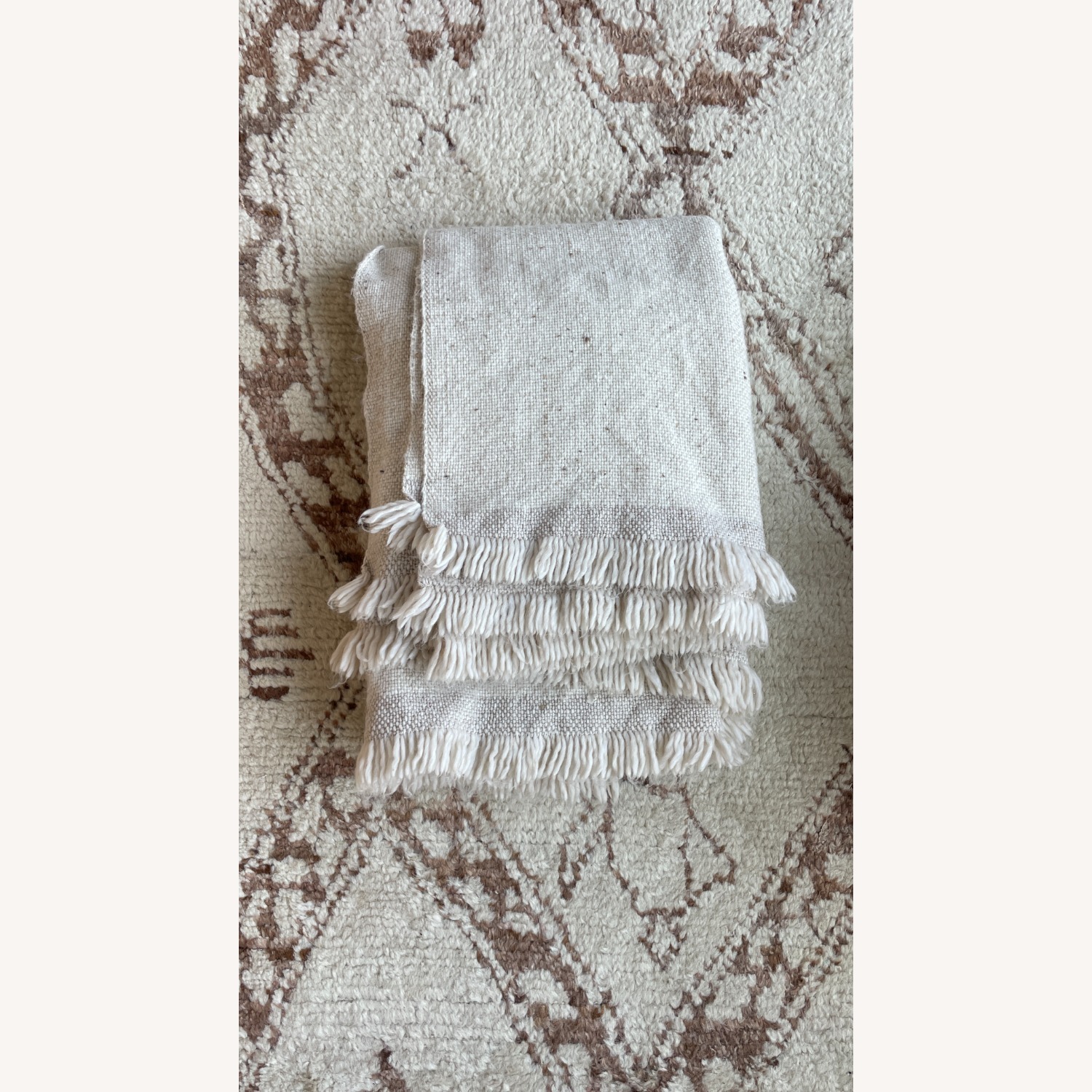 Seller's Notes:Speckled fuzzy and cozy woven throw blanket with raw edge tassels on two sides. Excellent condition, unused, sold as a pair. Heathered tan / oatmeal natural color with brown and tan speckles. Works beautifully with textured linen pillows in Japandi style aesthetic. Style over a chair or in a basket to add depth to your room.