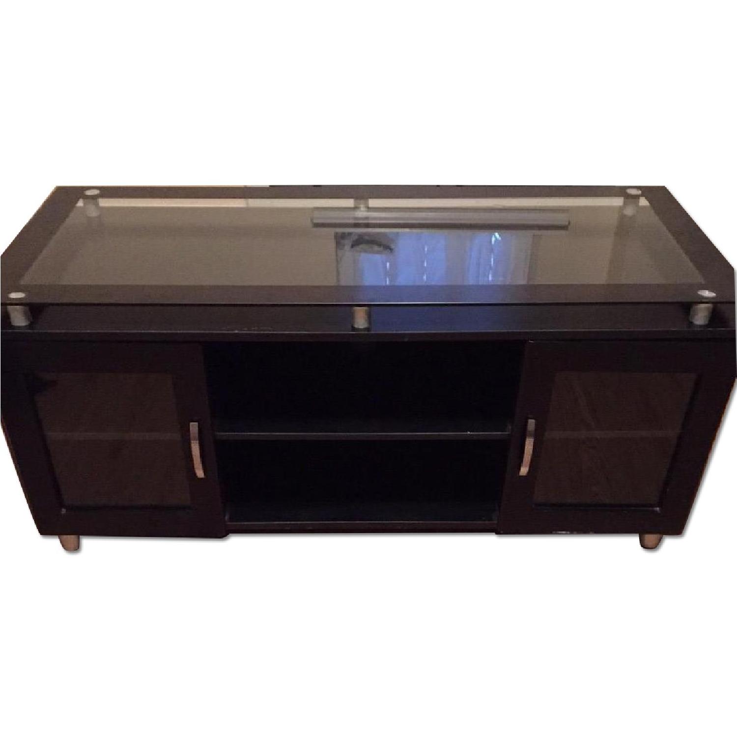 Seller's Notes:Simple but elegant TV stand! - Fits TV up to 43", my TV in the picture above is 43" - Ports for wires in all six shelfs - Glass top detaches from rest of stand for easy cleaning Blemishes - Small scratches here and there. Some more noticeable then others. The largest can be seen in the top-view photo - Right self wiggles - will still securely hold items