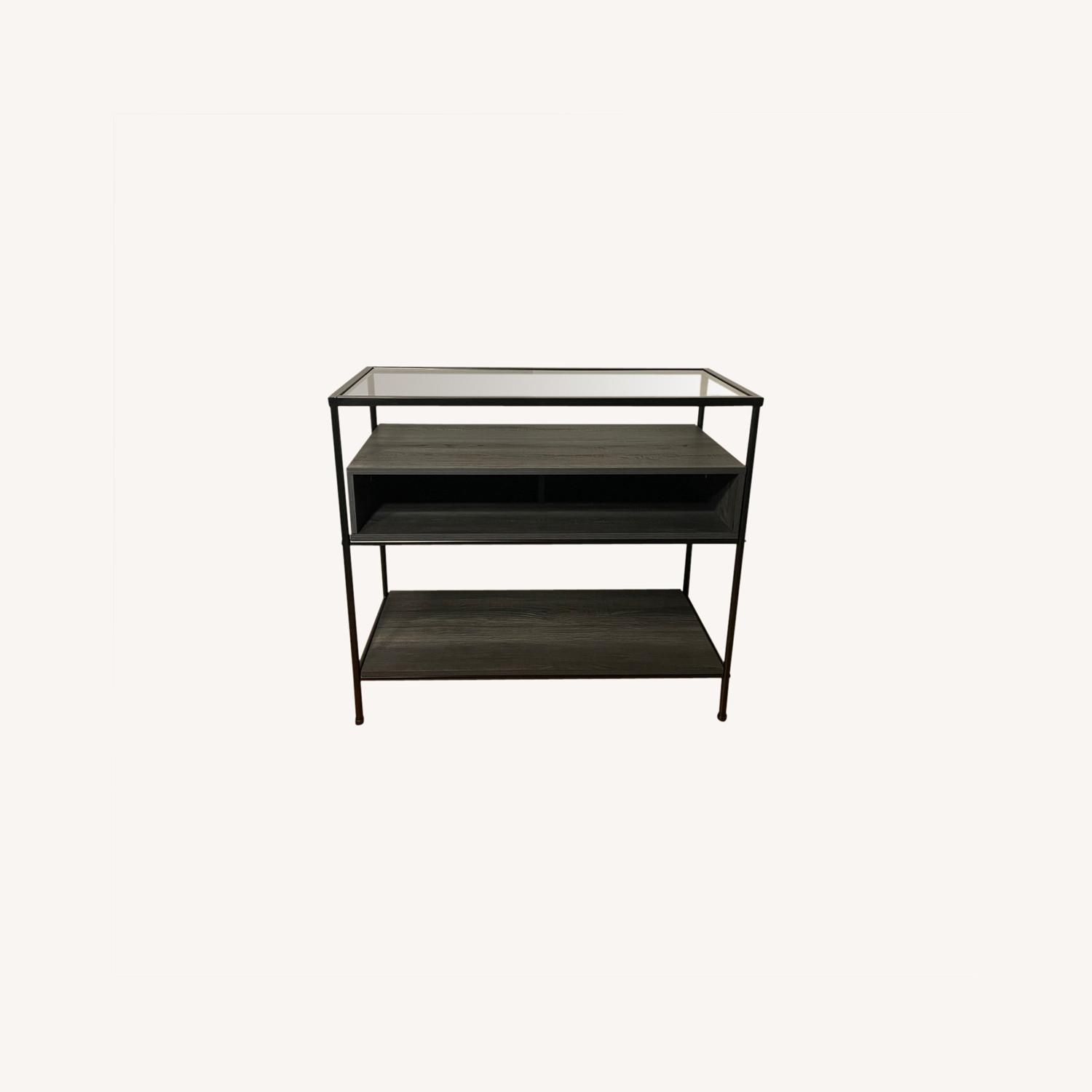 Seller's Notes:Glass top, metal frame, dark faux wood paneling, good as new - less than a year old. Only selling because we are moving.