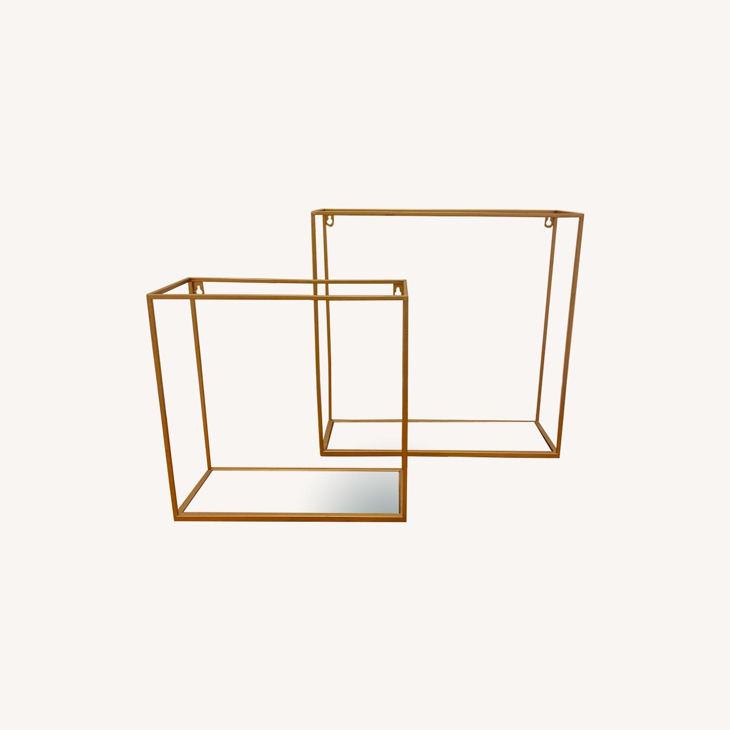 Seller's Notes:Pair of gold metal and wood floating shelves perfect for plants, entryway items, decor, etc. **Set of two includes one 14x14x7 shelf and one 18x18x7 shelf**