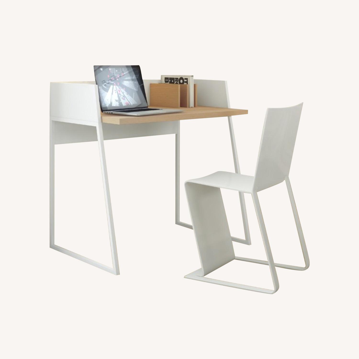 Seller's Notes:A small writing desk ideal for small spaces, the Volga desk has a compact size but still offers plenty of space to work with your laptop or tablet. Matt white MDF frame and a choice of yellow metals legs with a white top or white metal legs with an oak venner top. Perfect for bedrooms or the home office.