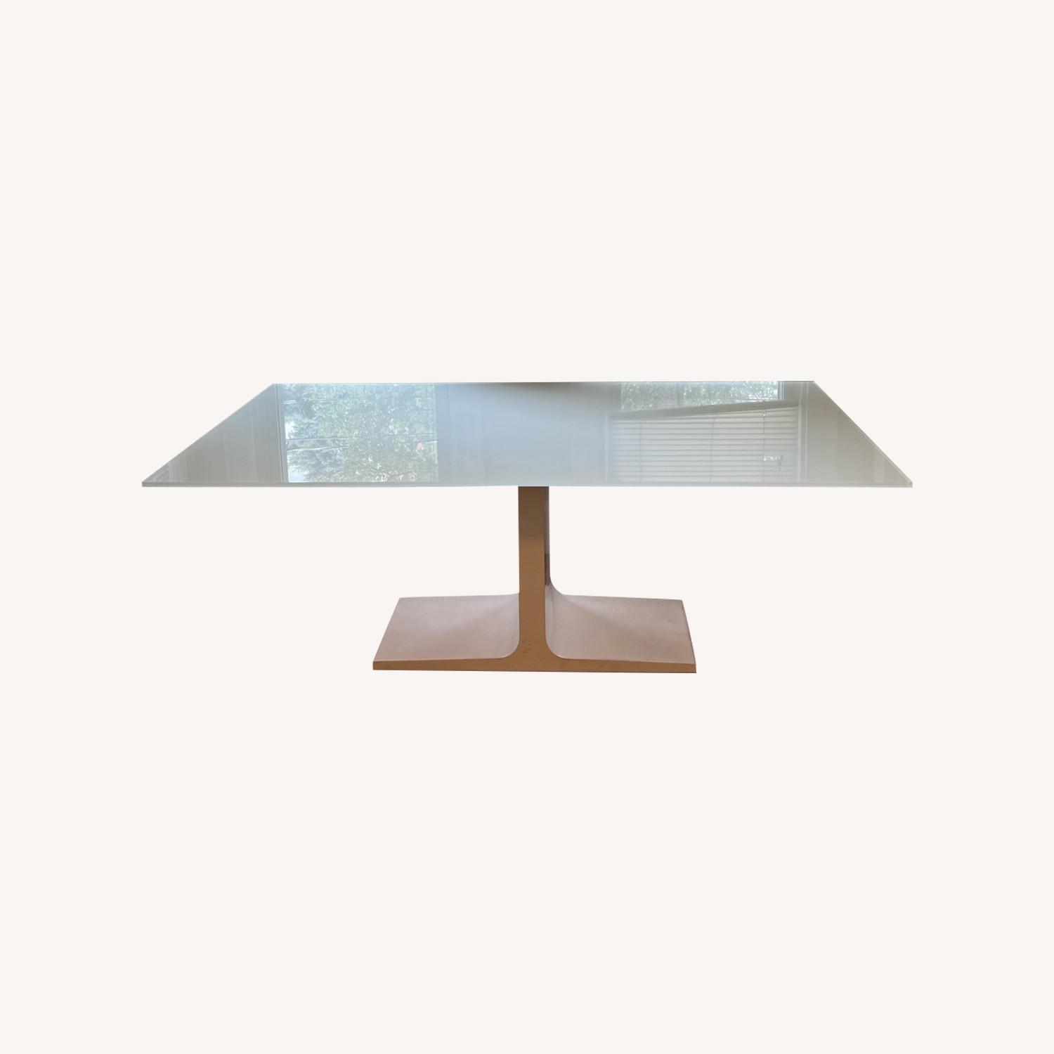 Seller's Notes:Perfect for a restoration project! This table was originally purchased for $6,500 from the Conran shop - the low price is because it needs some repair. White rectangular dining or office table with a glossy glass top and a sturdy pedestal base. The base has some scratches which can be fixed by repainting it. The tempered glass bottom has some gaps in the coverage which can be fixed with some white paint etc.