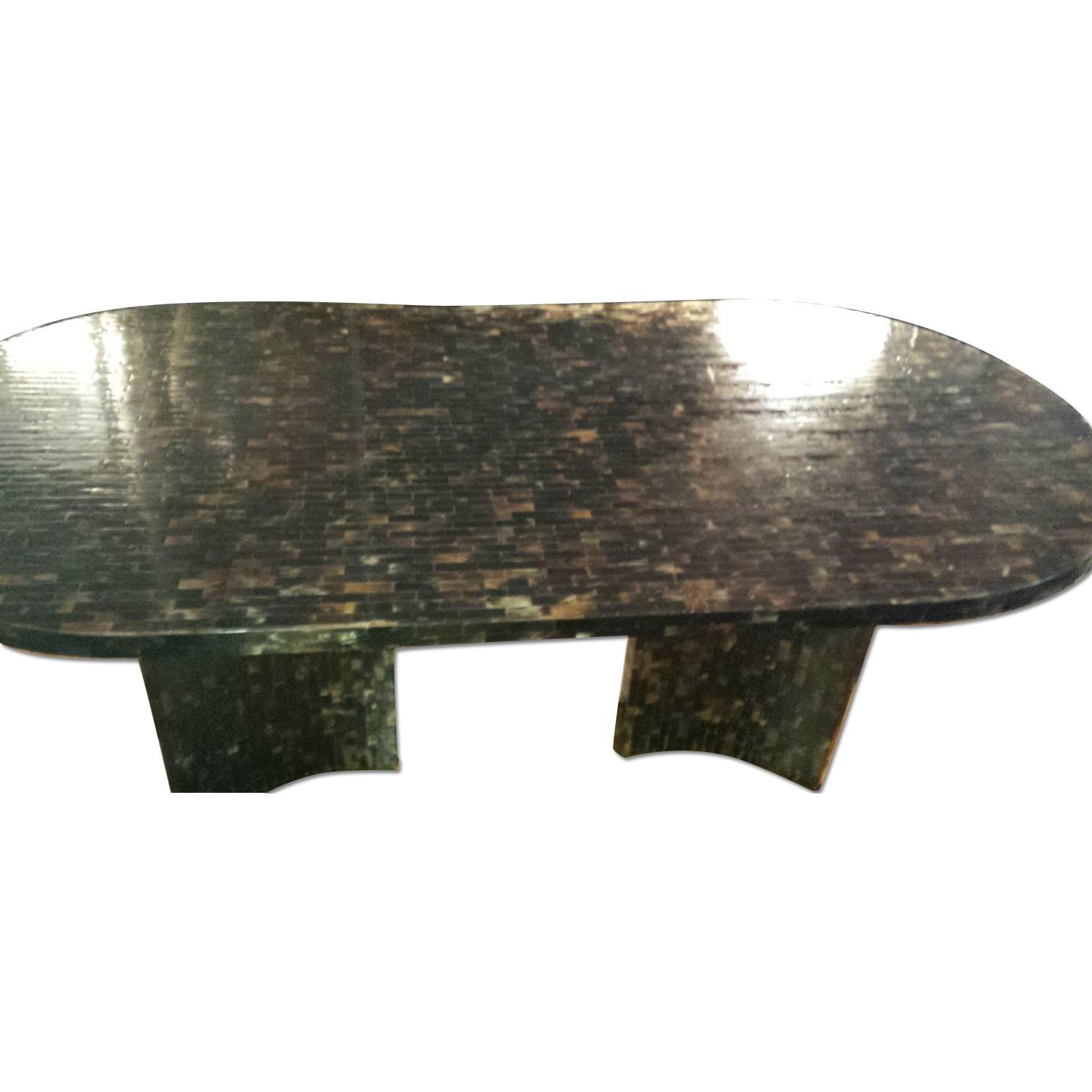 Seller's Notes:Amazing Karl Springer style Dining Table from the 1970's. Made in Columbia of Tessellated horn and wood. I wish I had room to keep this beautiful piece, however it is just too large for my space. Originally purchased for $5,000+, but as it is missing a few pieces of horn and has some slightly damaged areas, (which could easily be restored) (Hollywood Regency, Vintage, Modern Mid Century)