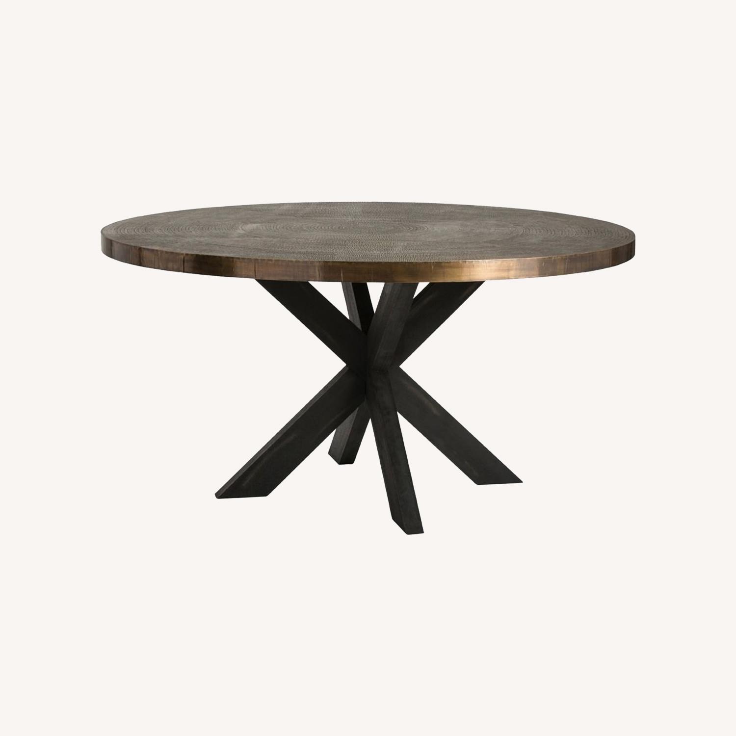 Seller's Notes:60” diameter, round dining table, textured antique brass top with black wood crisscross base. great condition, just doesn’t fit in our new apartment.