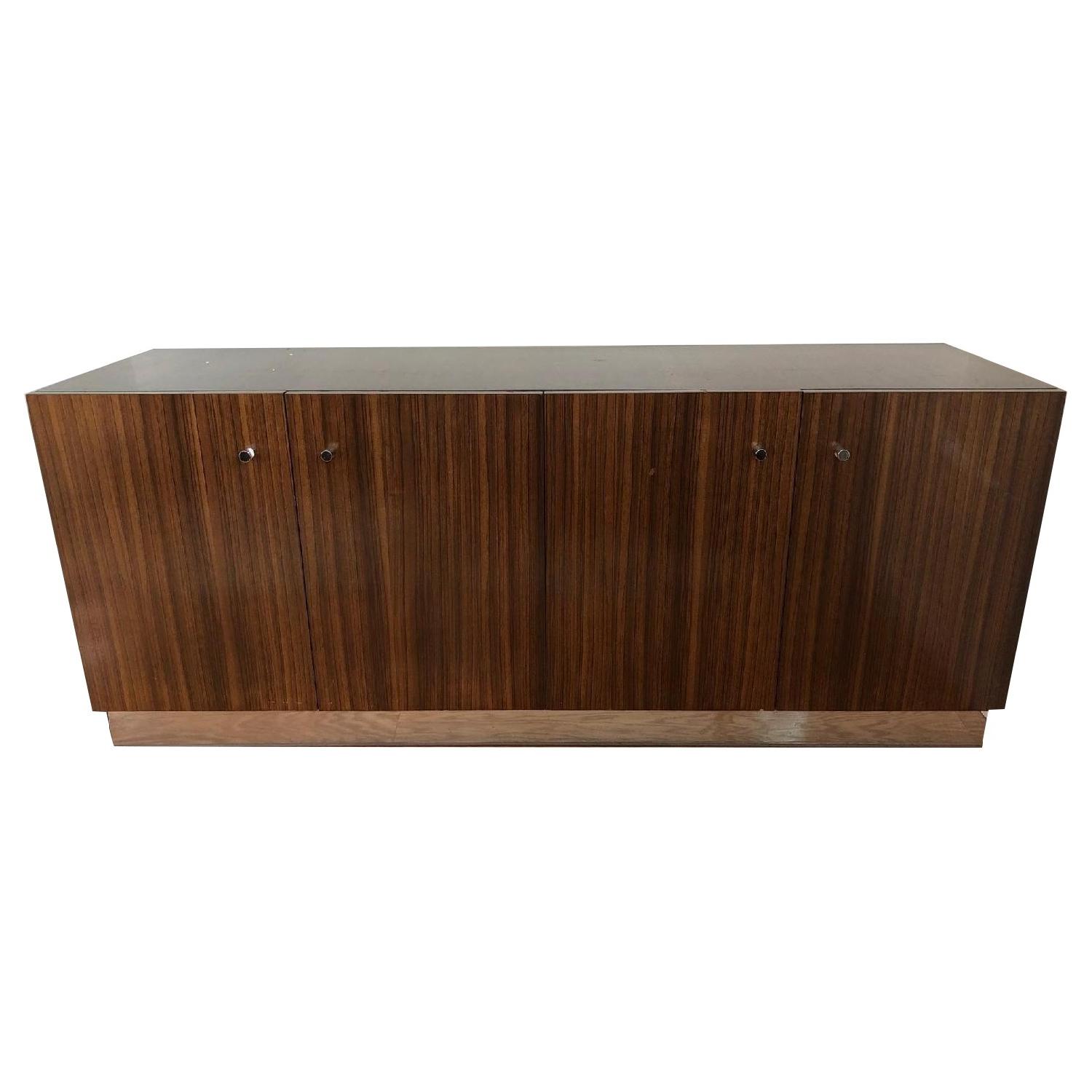 Seller's Notes:Gorgeous and sturdy Milo Baughman original with characteristic mid-century modern design. Beautiful rosewood color & one-of-a-kind reflective silver base. In great shape other than some discoloration on the top that can be easily hidden by decor or tv. Also could be easily remedied with a new finish. One small scratch on the front of the 3rd door from the left - barely noticeable. The solid doors open and shut nicely and the interior shelves can be adjusted as needed. Beautiful piece that we hate to part with, but it just doesn't fit properly in our new Manhattan apartment. Priced to sell fast, as furniture dealers charge much more for comparable Milo Baughman pieces. Great investment by a legendary designer.