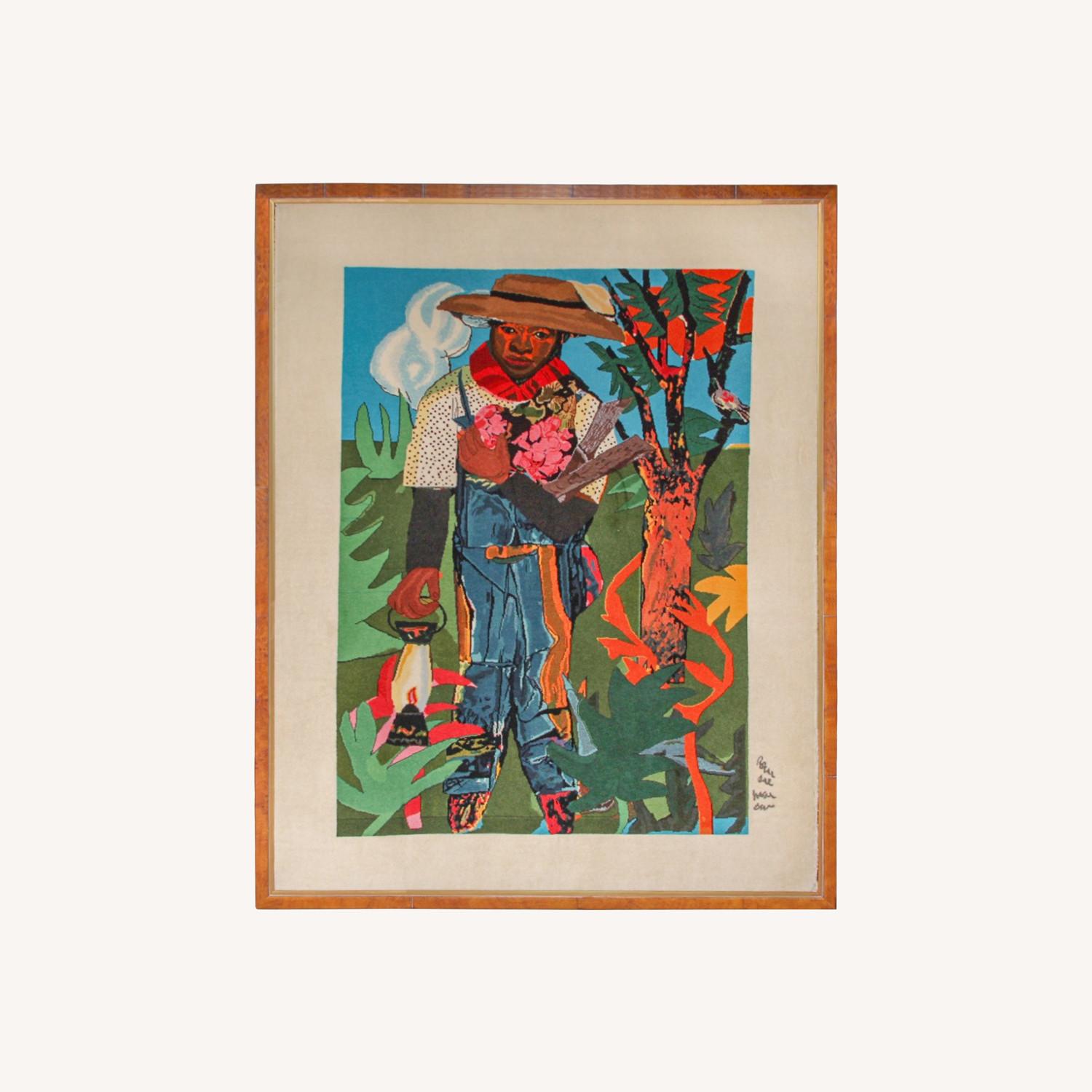 Seller's Notes:Mid-Century tapestry designed by Romare Bearden (1911-1988) and woven at Atelier Pinton Freres in Aubusson, France. An original limited edition piece from Bearden's Mecklenburg series of images depicting recollections from the artist’s childhood in rural Mecklenburg County, NC. A lively, colorful collage landscape scene portraying a black male portrait expressed in vibrant shades of blue, green, pink, orange, yellow, red brown, black and white. The artist's name is woven into the tapestry as well as signed on the reverse label. Romare Bearden was an African American artist, activist, and writer. “You should always respect what you are and your culture because if your art is going to mean anything, that is where it comes from,” the artist once said. Born on September 2, 1911 in Charlotte, NC, Bearden moved with his family to Harlem in 1914. His parents’ household became a social and intellectual hub for luminaries of the Harlem Renaissance, visited by the likes of Duke Ellington and Langston Hughes. From 1935 until 1937, Bearden was employed as a cartoonist for the Baltimore publication Afro-American, but for most of his life he worked as a social worker in New York, making art in his free time. A founding member of the Harlem Cultural Council and Black Academy of Arts, Bearden was elected to the National Institute of Arts and Letters in 1972. The artist received the Mayor's Award of Honor for Art and Culture in New York in 1984 and the National Medal of Arts in 1987. He died on March 12, 1988 in New York, NY. In 2013, his hometown of Charlotte dedicated a city park in honor of Bearden’s legacy. Today, the artist’s works are held in the collections of the Metropolitan Museum of Art in New York, the Museum of Fine Arts in Boston, the Art Institute of Chicago, and the Philadelphia Museum of Art, among others.