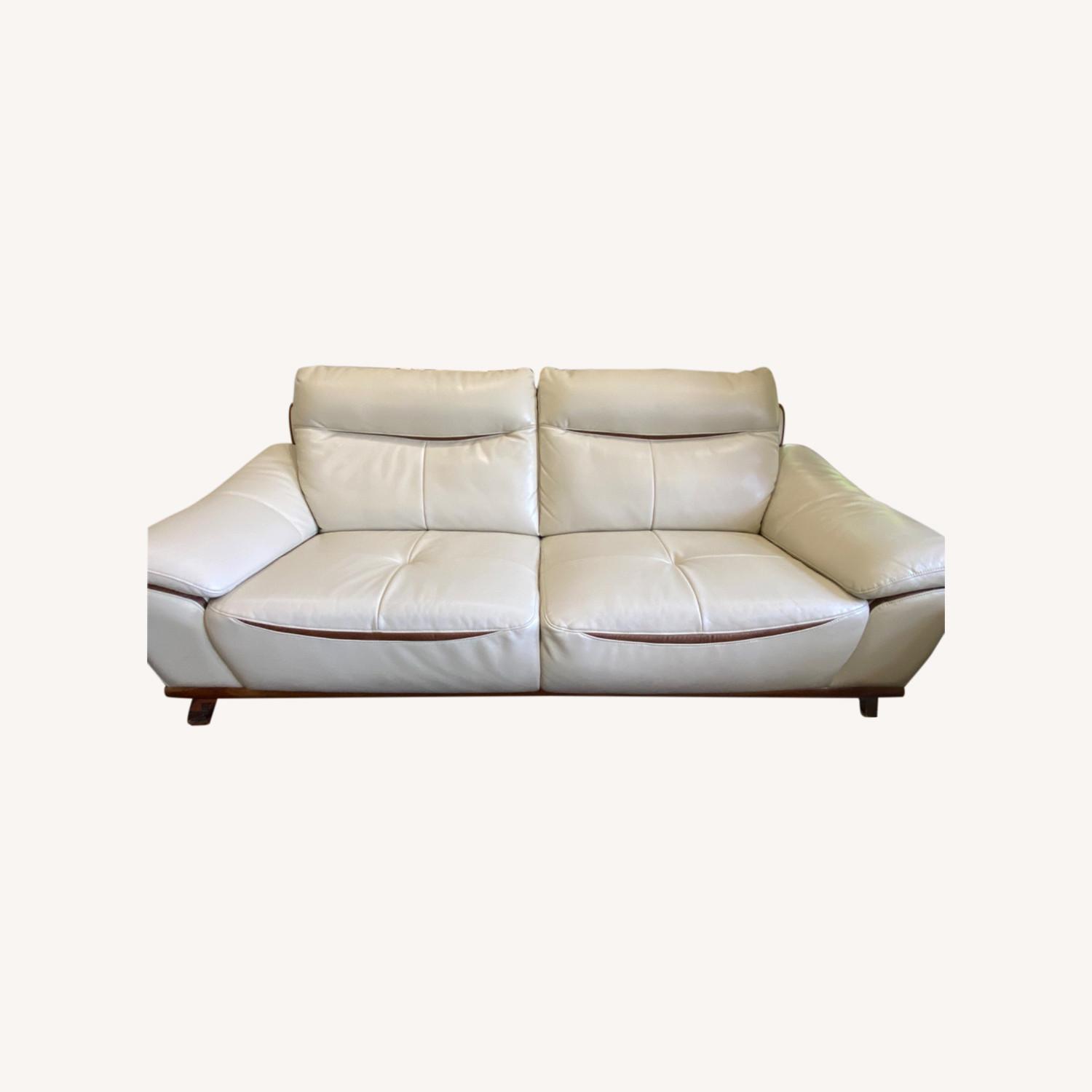 Seller's Notes:Britney sofa collection from The Roomplace. Purchased less than 5 years ago. Still in good condition. Minimal scratch marks (see last 4 photos). Pearl white and accent Brown faux leather with reflective metal legs. Sits atop of a wood base. Collection still being sold at The Roomplace. Bought this as a 2 pc set, original value $2579.98. Dimensions Height: 35.00" Width: 39.00" Length: 87.00" Weight: 130.00 lbs.