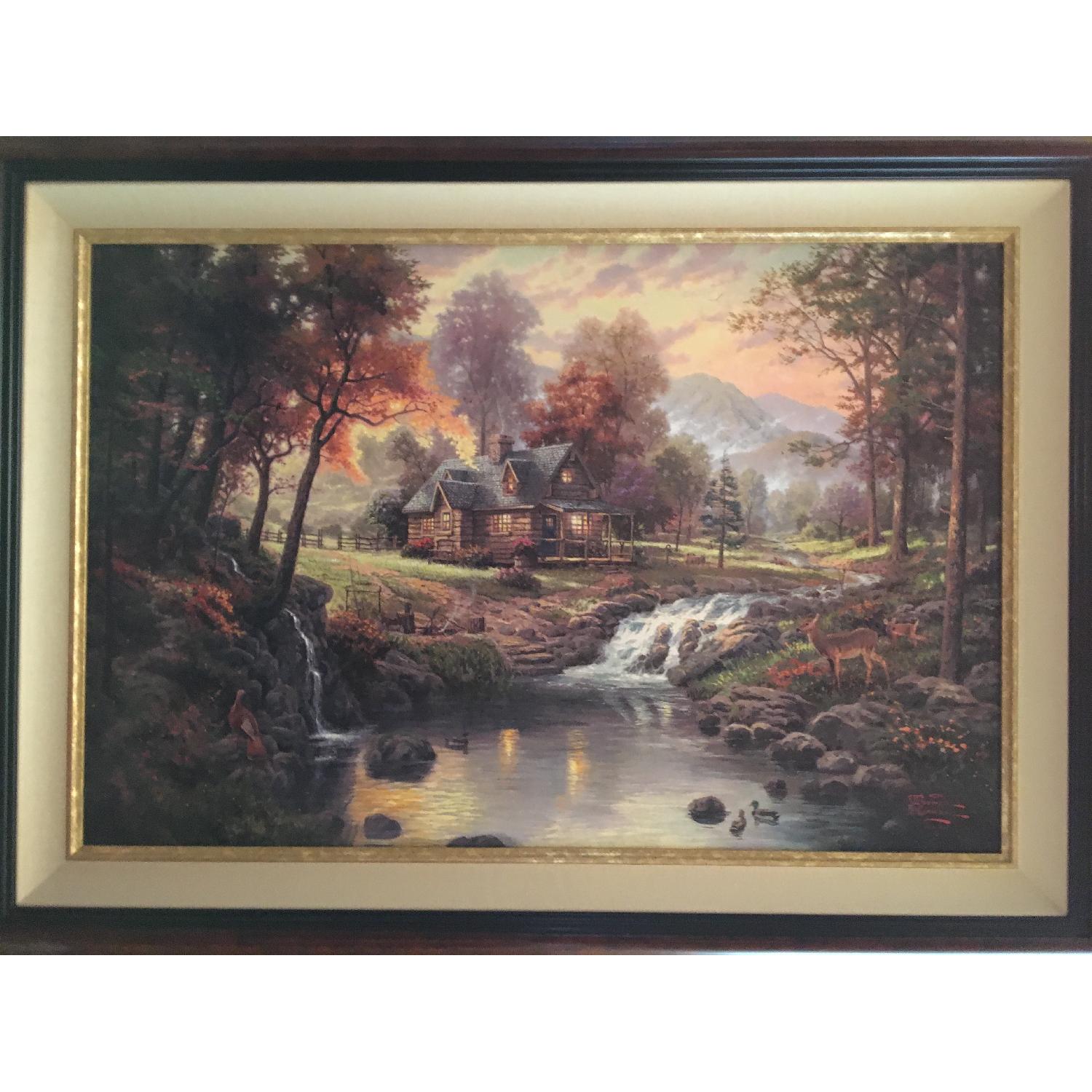 Seller's Notes:Authentic Thomas Kinkade Limited Edition Art "Mountain Retreat" (43595 971895). The beautiful scenery comes alive with vibrant colors, rich textures and color tones from the "Painter of Light" on acid-free, museum quality canvas (24"X36"). Framed in Classic Burl, genuine hardwood. Elegant outer and inner edges are a rich dark cherry with cream linen liner and bright gold filet that focuses attention on the artwork.