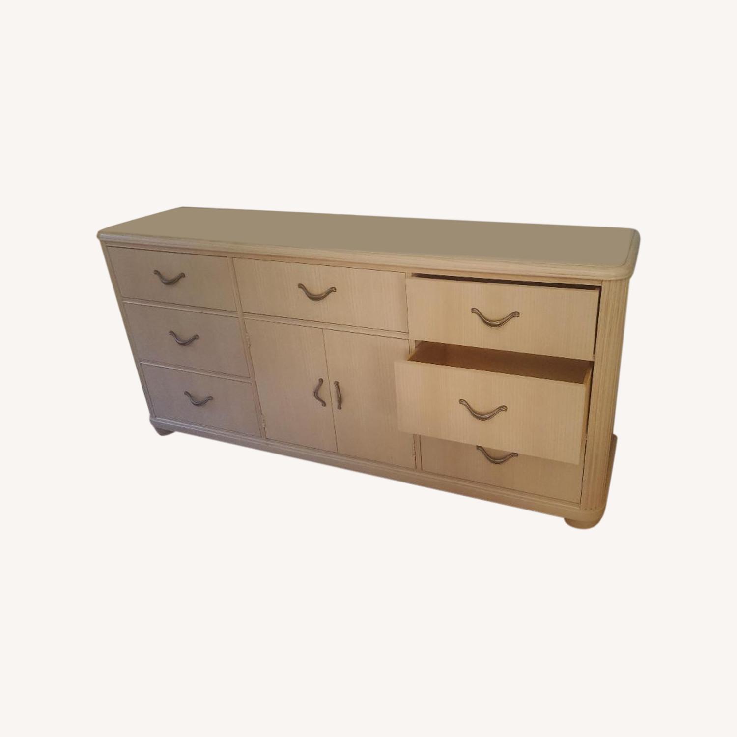 Seller's Notes:Dresser with 3 drawers on either side, middle has 1 top drawer plus two doors which open inside to 2 drawers. Side of dresser has dovetail design.