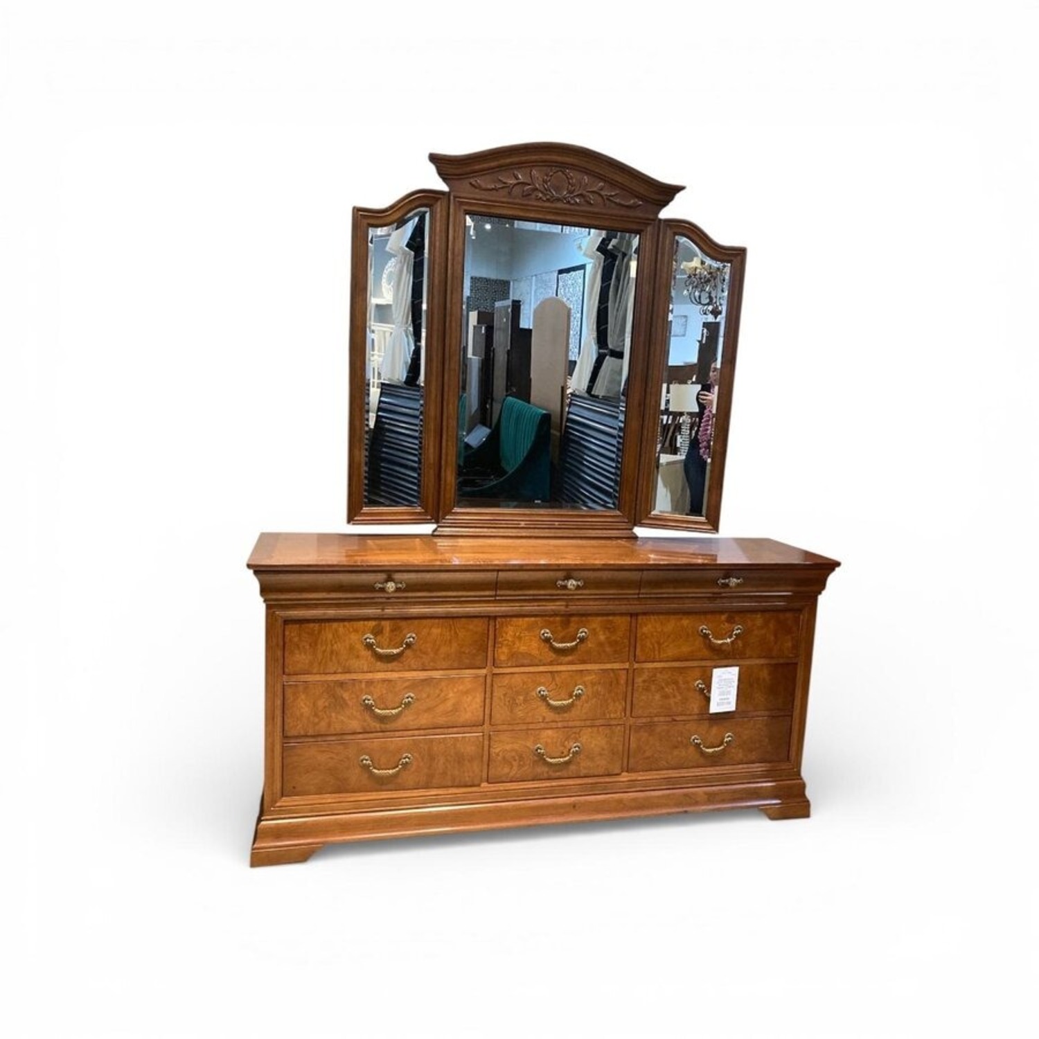 Seller's Notes:Make a statement with this elegant Thomasville Birchwood 12-Drawer Dresser with Mirror, a beautifully crafted piece that blends timeless sophistication with exceptional functionality. Designed with attention to detail and quality craftsmanship, this dresser showcases the refined style and durability synonymous with Thomasville Furniture Industries. Constructed from rich birchwood, the dresser highlights a warm, inviting finish that enhances the natural grain patterns of the wood. Its generous twelve-drawer configuration provides abundant storage, keeping clothing and essentials neatly organized while maintaining a polished, uncluttered look. Each drawer is thoughtfully designed for smooth operation and lasting durability. The coordinating mirror adds both depth and elegance, creating a complete and cohesive bedroom centerpiece. Its classic silhouette and clean lines allow it to complement traditional, transitional, and even contemporary interiors with ease. Perfect for a primary bedroom or guest suite, this Thomasville Birchwood dresser with mirror offers substantial storage, enduring craftsmanship, and timeless style—an investment piece designed to be enjoyed for years to come.