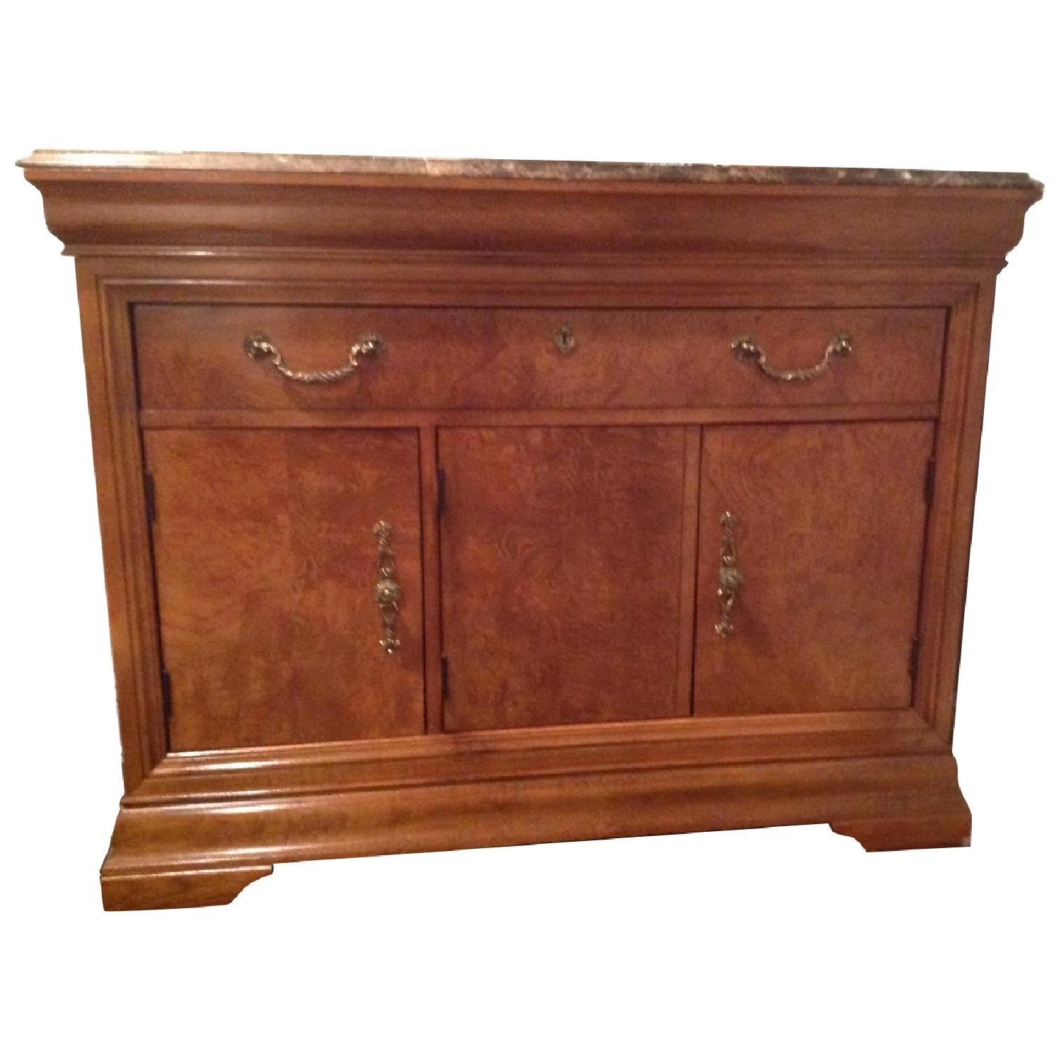 Seller's Notes:This is a great looking piece solid wood, burl wood, made beautifully. Has marble top large draw and large 3 door bottom storage, is on wheels as well, only needs to be touched up on bottom some minor scratches by wheels , See pics.