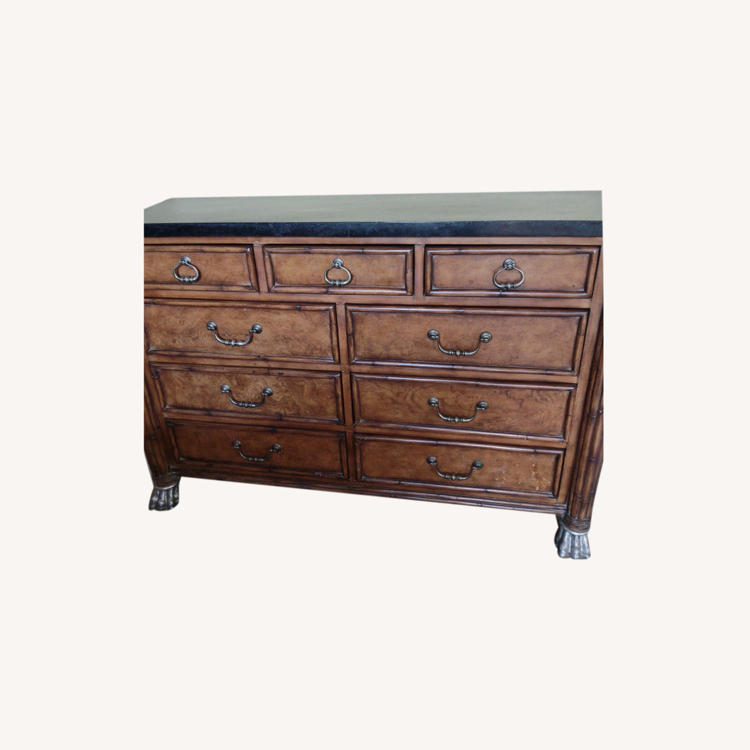 Seller's Notes:Dresser with marble top and metal feet.Has 9 draws excellent condition. Made by Thomasville part of the killimajaro collection. 68 in long. Very heavy.