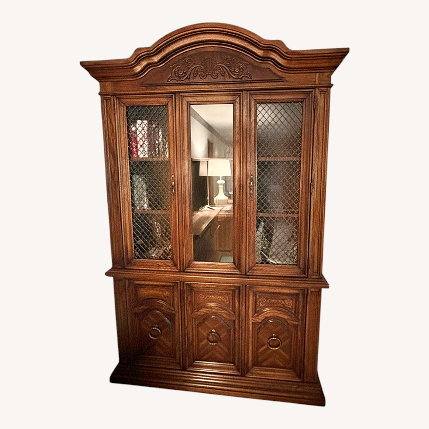 Seller's Notes:Produced as part of Thomasville's popular mid-century Serenade collection, this piece exemplifies the American fascination with French Provincial aesthetics during the 1960s and 70s. Thomasville, founded in North Carolina in 1904, became a household name by blending traditional European motifs with mass-production quality, making luxury styles accessible to the growing American middle class. A large, two-piece French Provincial style hutch and buffet featuring an arched bonnet top with floral carvings and diamond wire-mesh door inserts.