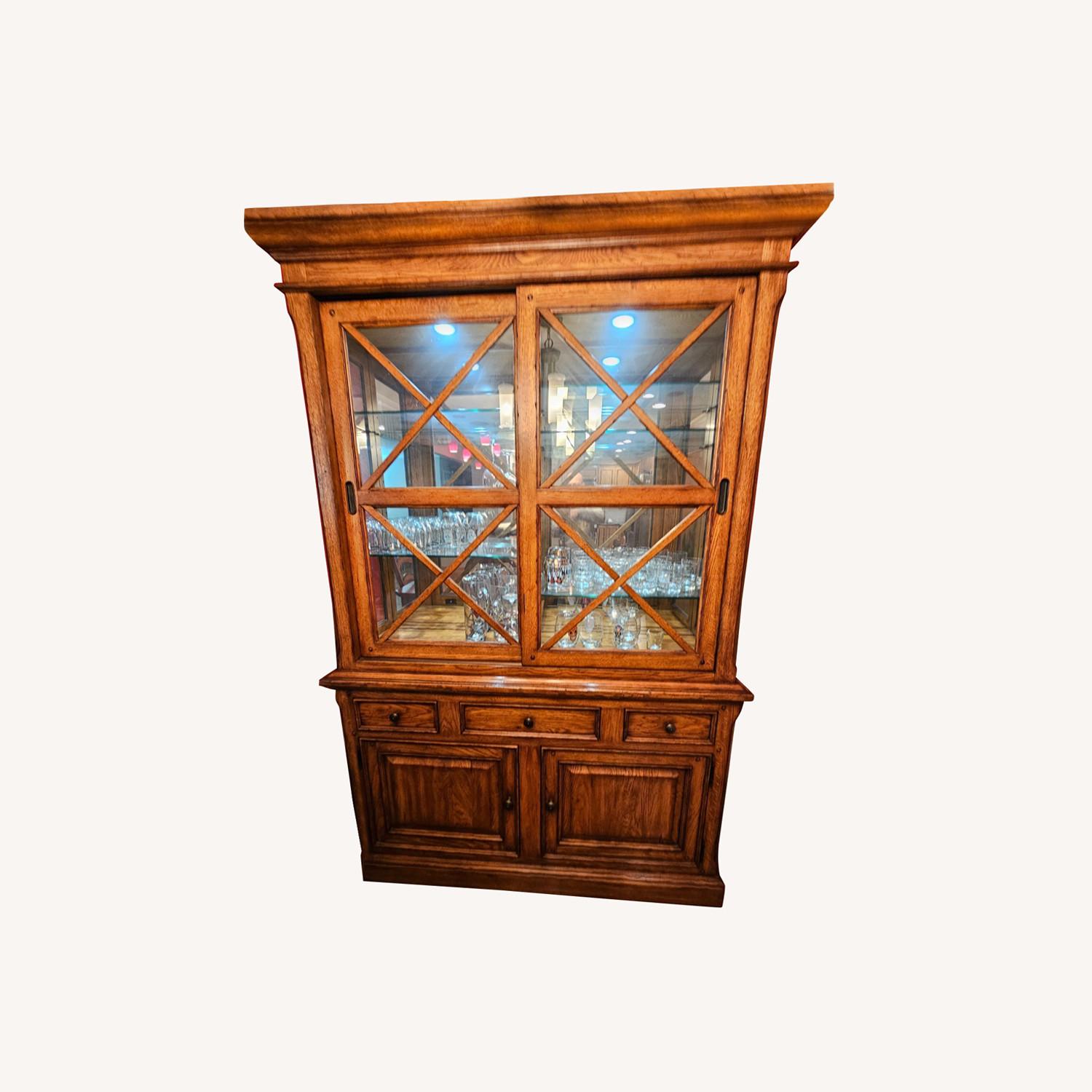 Seller's Notes:This walnut hutch has glass doors, 3 drawers, and 2 lower cabinets with shelving. Adjustable lighting inside the upper half, with glass shelves. This is a very solid and heavy piece designed to last for decades. No scratches or scuffs.