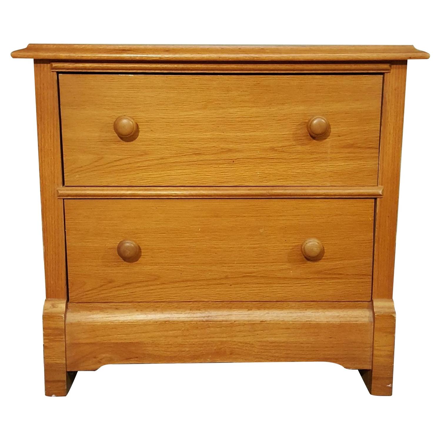 Seller's Notes:I purchased this as part of a bedroom set from a friend when I got my first apartment. Set includes this 2-drawer side table, an 8-drawer dresser with mirror, and a full/queen headboard (listed separately). The furniture is very solidly built and will last a long time, but there is some surface damage on each piece (water discoloration, scratches and chips). On the nightstand, it's mostly the top surface, and the top edge of the drawer (both pictured). These could be remedied by painting or refinishing. The sides and front are in good condition. Nightstand: 26"w x 24"h x 17"d Inside drawer dimensions are 19.75"w x 13.5"d x 6.5"h