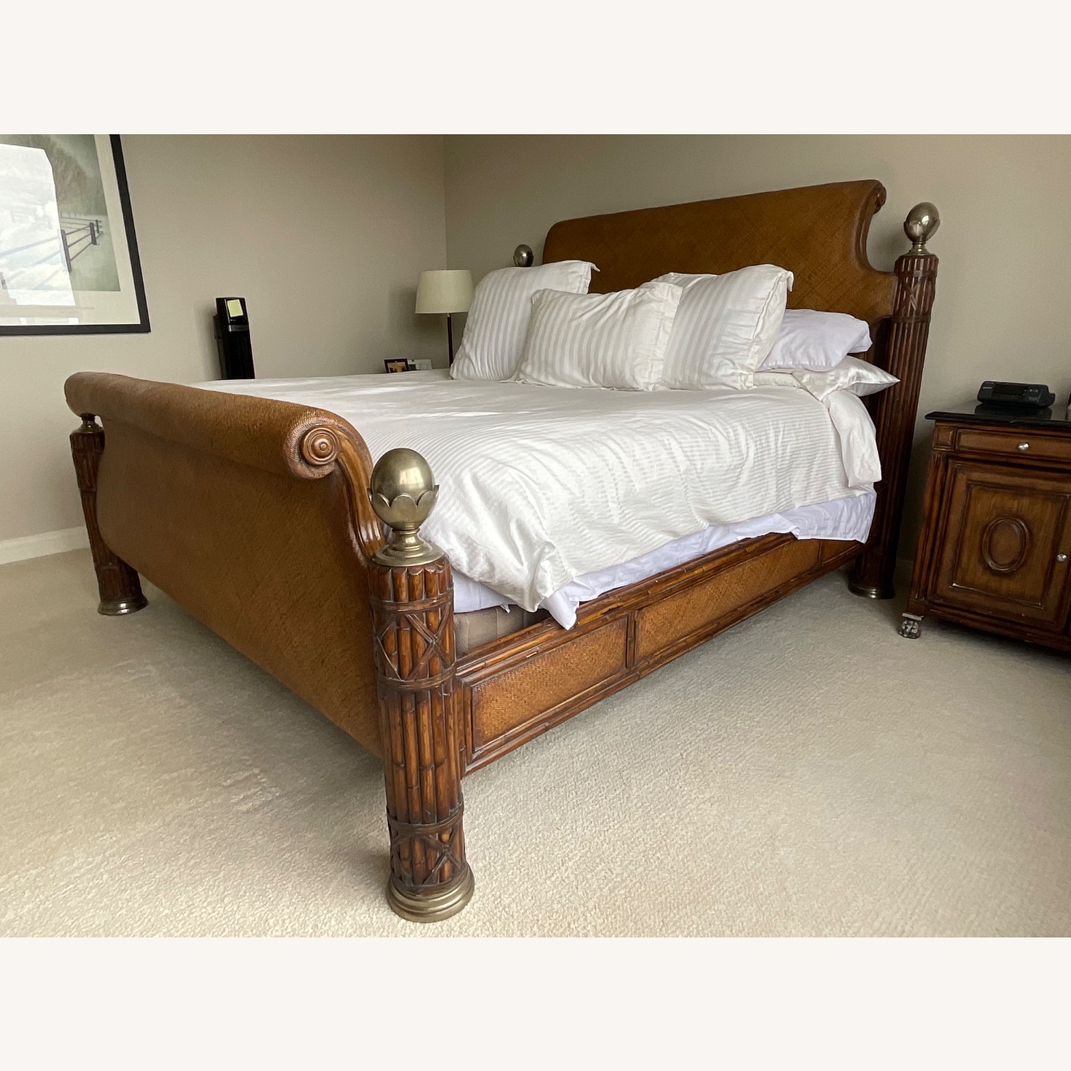Seller's Notes:This Thomasville Kilimanjaro King Bed is a part of the Ernest Hemingway collection. It includes a headboard, footboard, two side rails, and a mattress support system. The bed’s unique, skilled detail includes twill, rattan, ostrich egg finials, and an odyssey finish. The floor dimensions required are 88 1/4 inches x 95 1/2 inches. The bed was originally purchased in 2000. The wear and tear is minimal and in great condition!