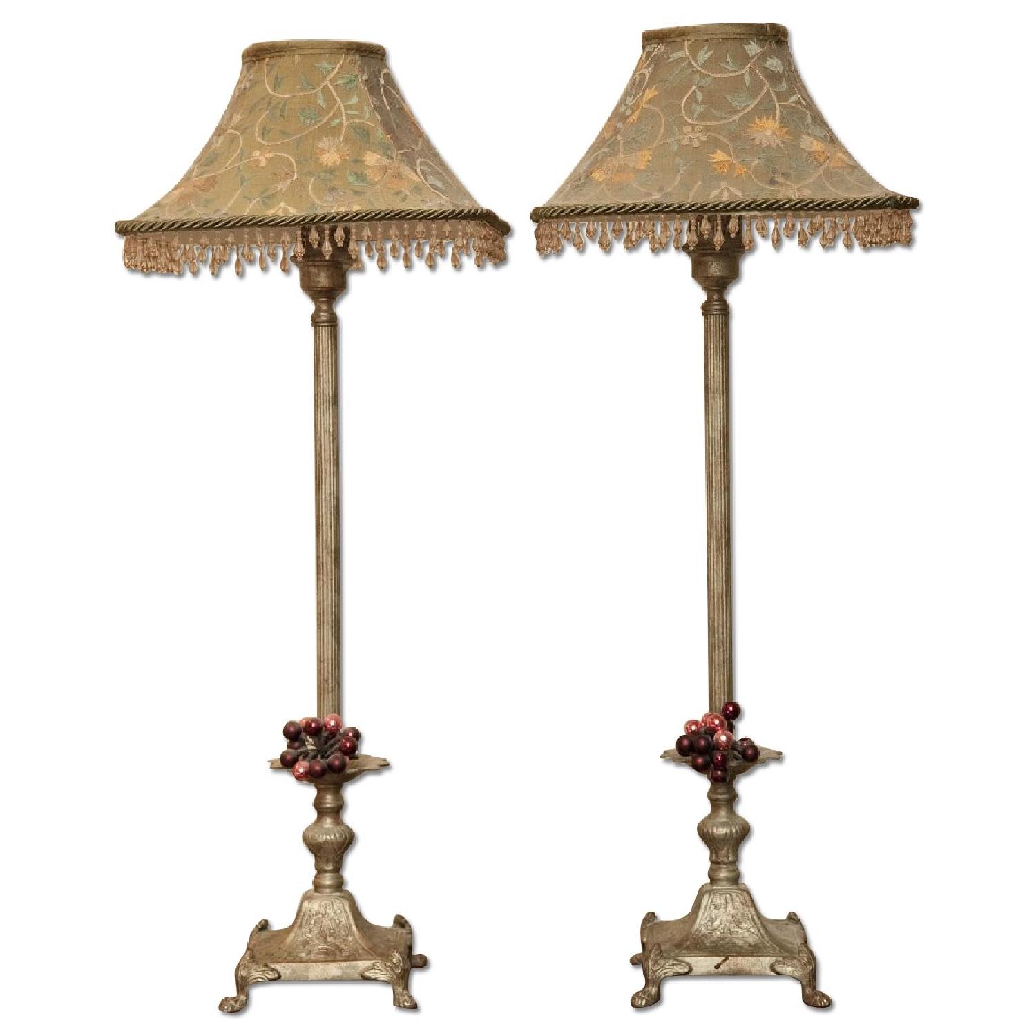 Seller's Notes:Willing to NEGOTIATE :) TWO (2) beautiful MINT Condition Frederick Cooper Thomasville Lamps for Sale. They are champagne colored with Teal Leaves and crystal hanging tassels from each lamp (see picture). They come from a clean, smoke-free, pet-free, and dust-free home.... They are pure silk shades Two (2) Lamps are for Sale. and they are in MINT condition .. Exact Measurements Are as follows: The Height of these Lamps are as follows: 29 Very Bottom Width: 6 (Square part)