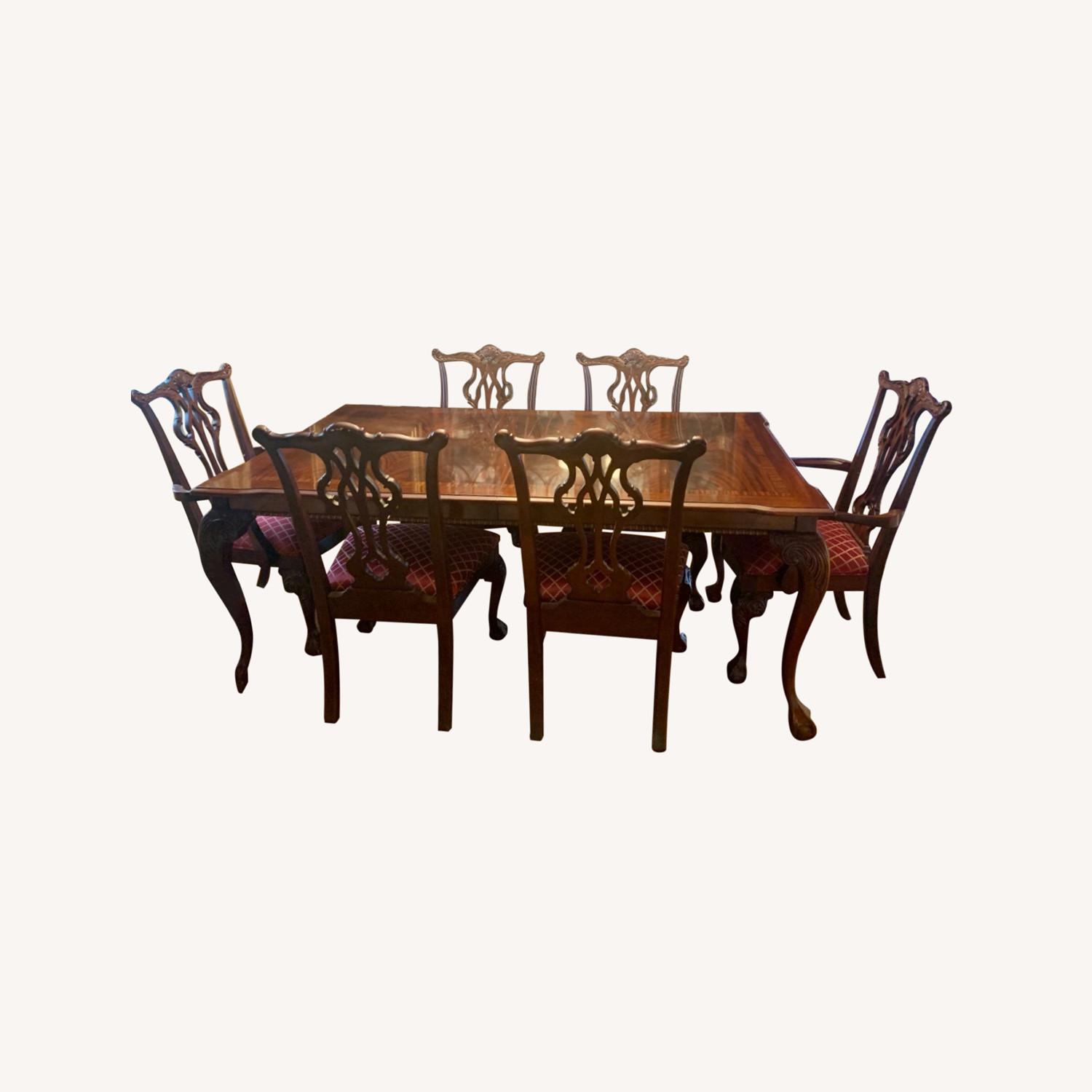 Seller's Notes:Comes with all the chairs shown plus 6 additional side chairs and 2 table leaves to extend the table to 115 inches. Seating for 12 at this large grand mahogany table with intricately carved legs. Sold at a fraction of it’s retail value. Minor imperfections on the tables surface.