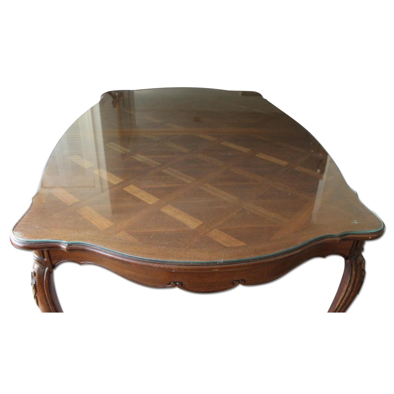 Seller's Notes:This Dining Table is French Provincial and of quality construction. Made by Thomasville. There is a glass overlay that can be removed. The table does have the ability to extend, however, when we received the table, the extension was lost, therefore a new one would need to be made. It is oak wood and in overall very good condition. Dimensions: 66 inches long 44 inches wide 29 inches tall I received this item from a family member, so the age was a guess as I am unsure when it was purchased and by who. It is very beautiful, we used this table regularly. Please see my other listings for a matching Buffet/Sideboard and Flip top bar server/liquor cabinet