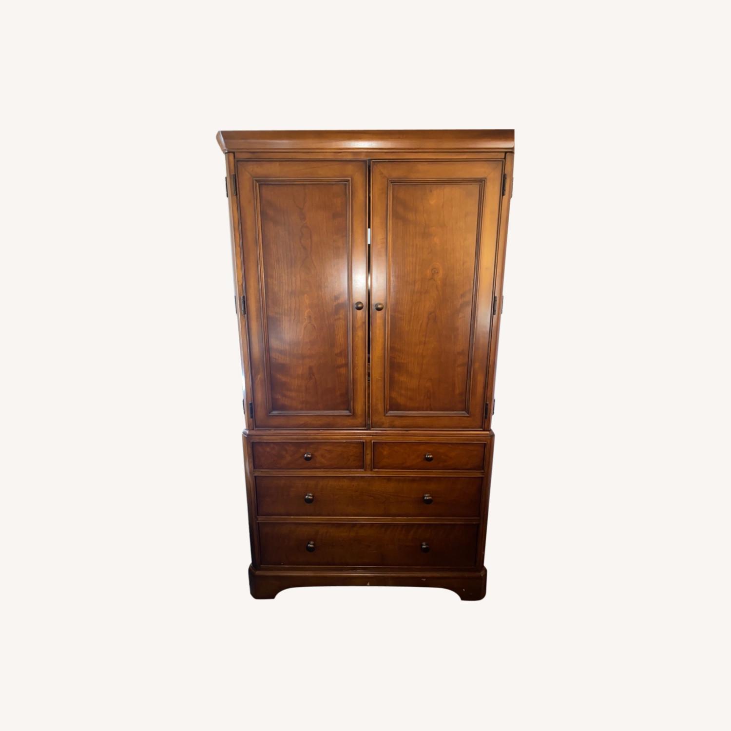Seller's Notes:Thomasville Brown Solid wood Armoire. Good condition with minor blemishes at base and at interior base of cabinet door ( as shown in photo ). Not exposed to sun or smoke and finish has like new gloss. Full matching bedroom set available including 2 nightstands , King post bed , Dresser w mirror. Delivery available via AptDeco flat rate delivery ( seller will pay 50% of AptDeco flat rate delivery service only )