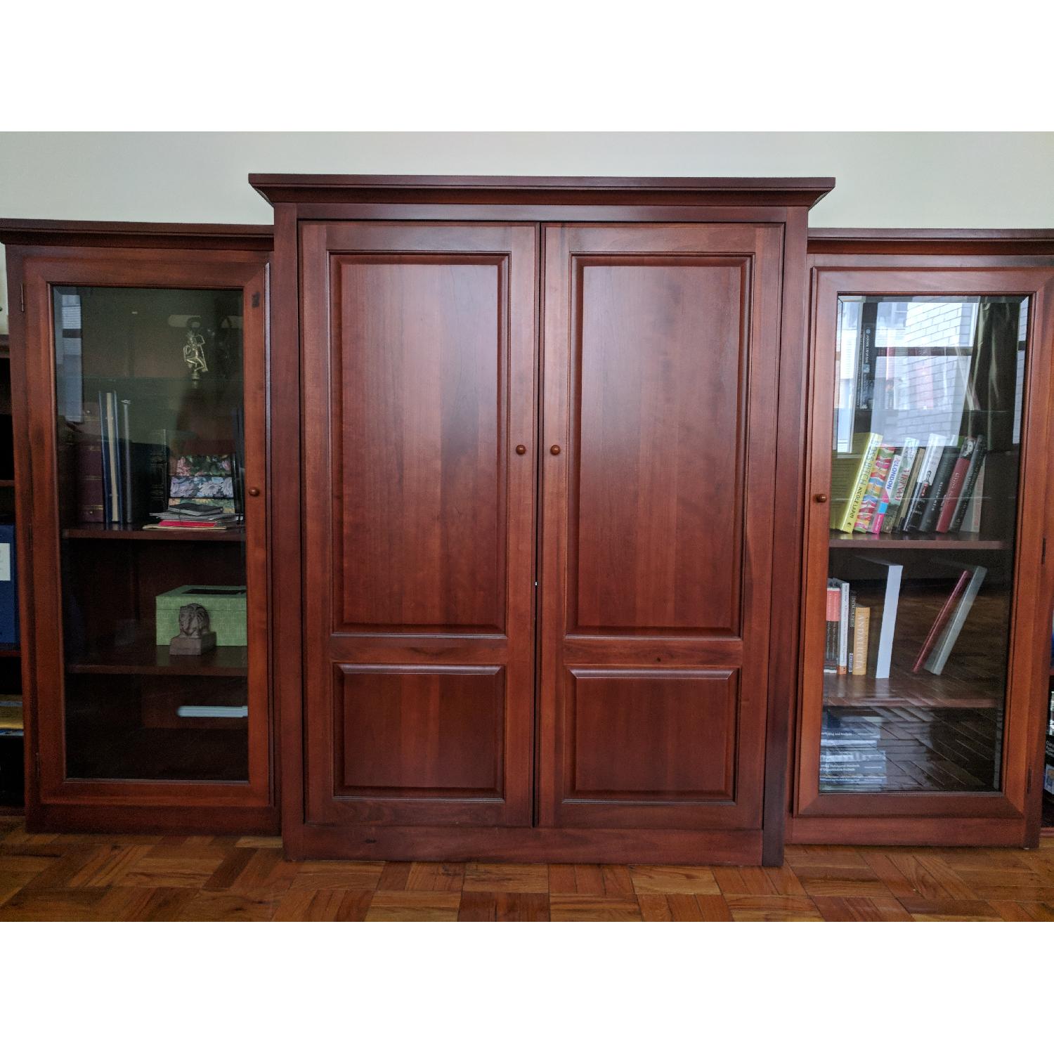 Seller's Notes:Thomasville solid wood media cabinet and matching side display units. Center cabinet fits up to 32" TV. Doors can be closed to hide TV and media equipment when not in use for clean look. Center unit measures 56"h x 45"w x 24"d. Side units made of solid wood with glass doors. Perfect for displaying keepsakes and memorabilia. Each measure 53"h x 25"w x 20"d. Pieces are in excellent condition, no damage or scratches. Right door closes a little slower and squeaks but can likely be fixed with a little oil. Redecorating and unit does not fit with new decor.