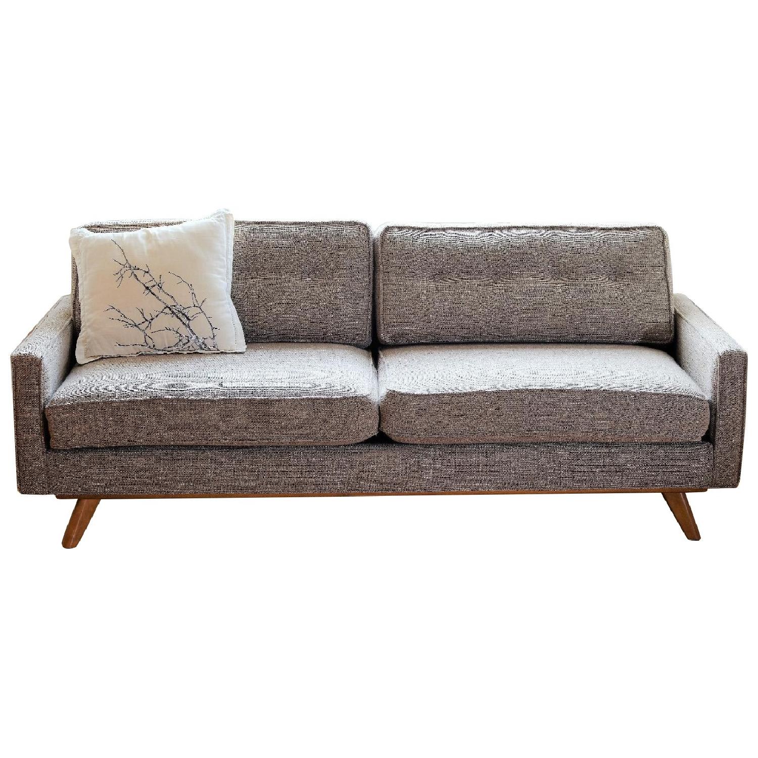 Seller's Notes:Like new, mid-century inspired Taylor sofa / couch from Thrive Furniture. Honey blonde wood legs, beautiful mid-century nubby 'doeskin' colored upholstery that's somewhere between a taupe and grey (see close-up photos). No stains, scratches, or blemishes. We're moving and don't want to store this awesome piece.