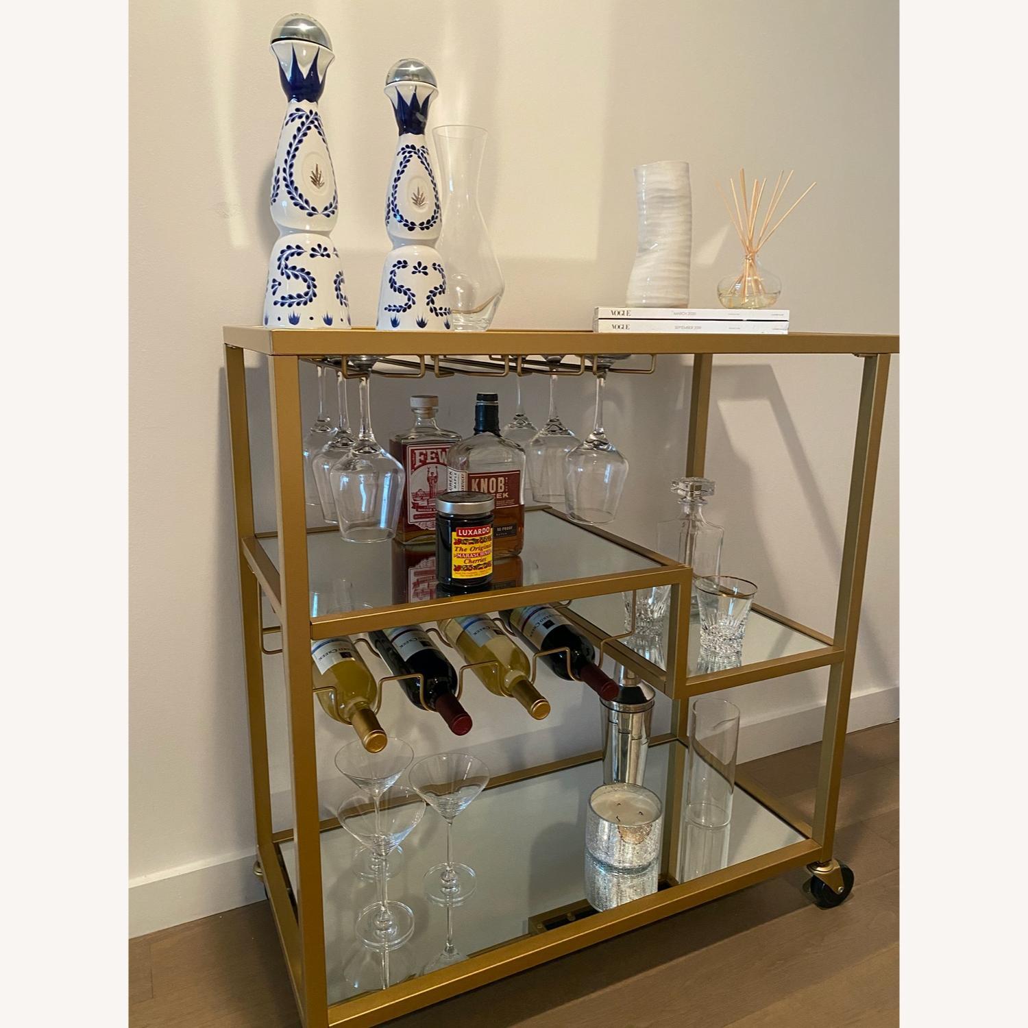 Seller's Notes:Beautiful gold and glass bar cart. Top shelf is mirrored. Was used for 1 year with minor scratches on handle. Product Details: Shelf Weight Capacity: 10 lb. Shelf Weight Capacity: Top shelf: 10 lb. Wheels Locking Wheels: Yes Wine Bottle Storage Included Bottle Capacity: 4 Also includes 3 different rails to hang glassware. Great for wine and martini glasses!
