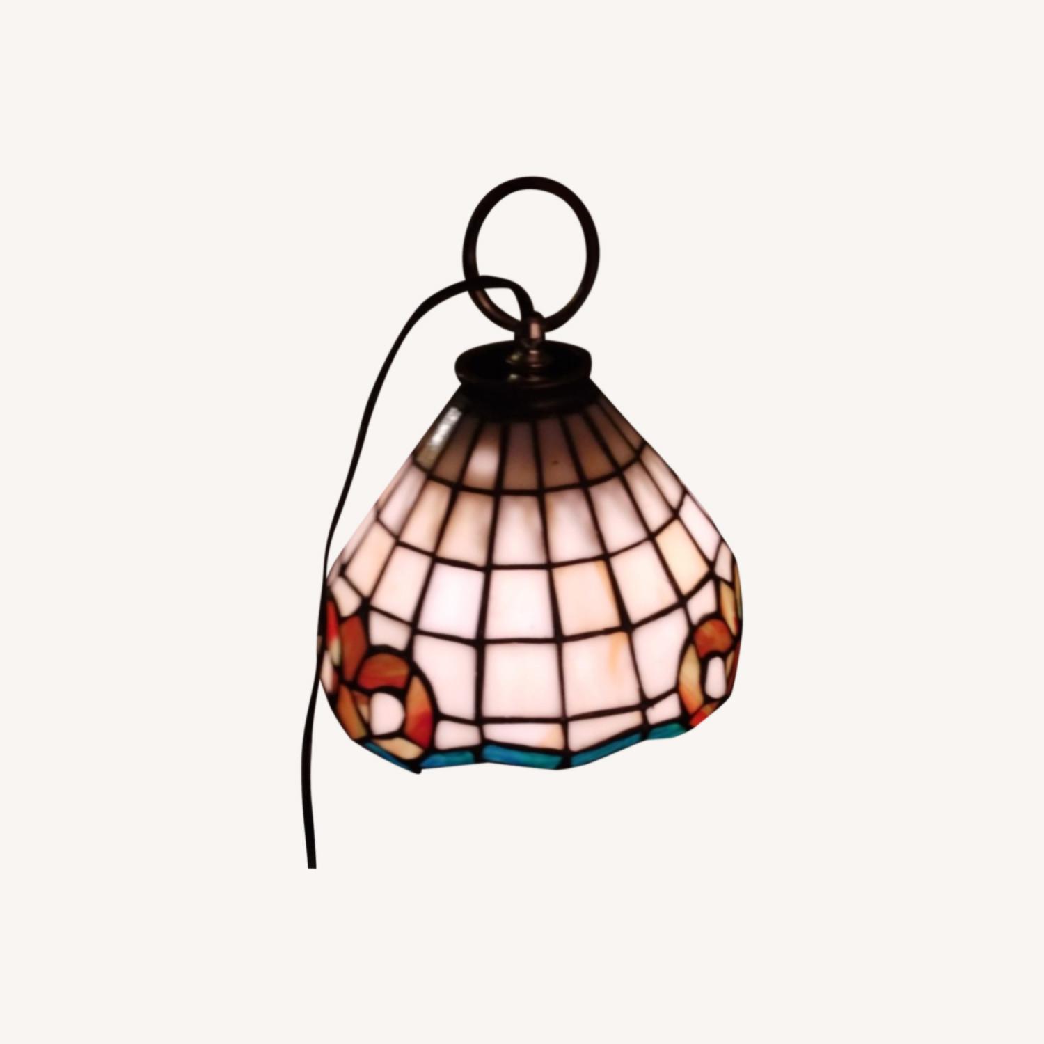 Seller's Notes:7 1/4" wide at bottom 2" wide at the top and 6" high cute little refurbished tiffany shade