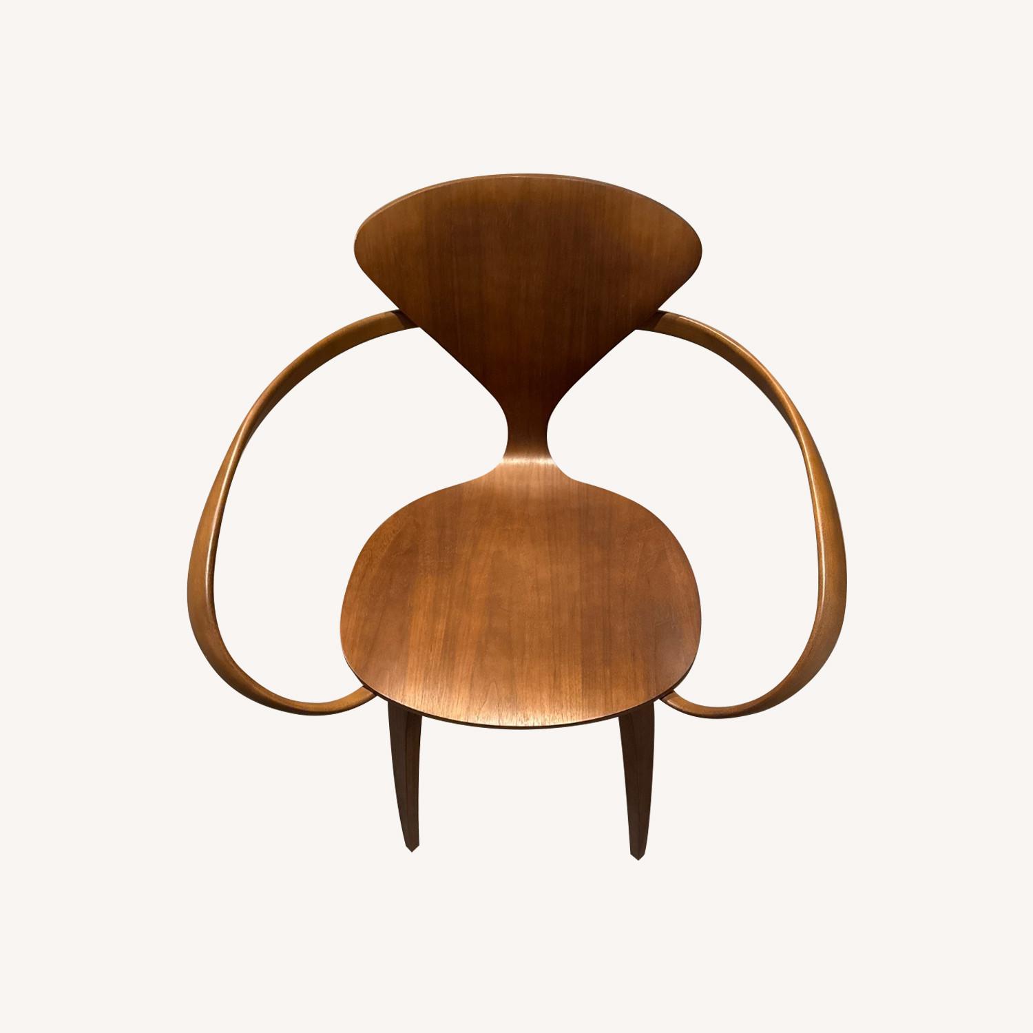 Seller's Notes:The Lounge Armchair is the latest addition to the Cherner seating collection. The molded plywood shell, solid bentwood arm and laminated wood legs are combined to produce a dynamically comfortable and curvilinear form. A graceful addition to the home or office.