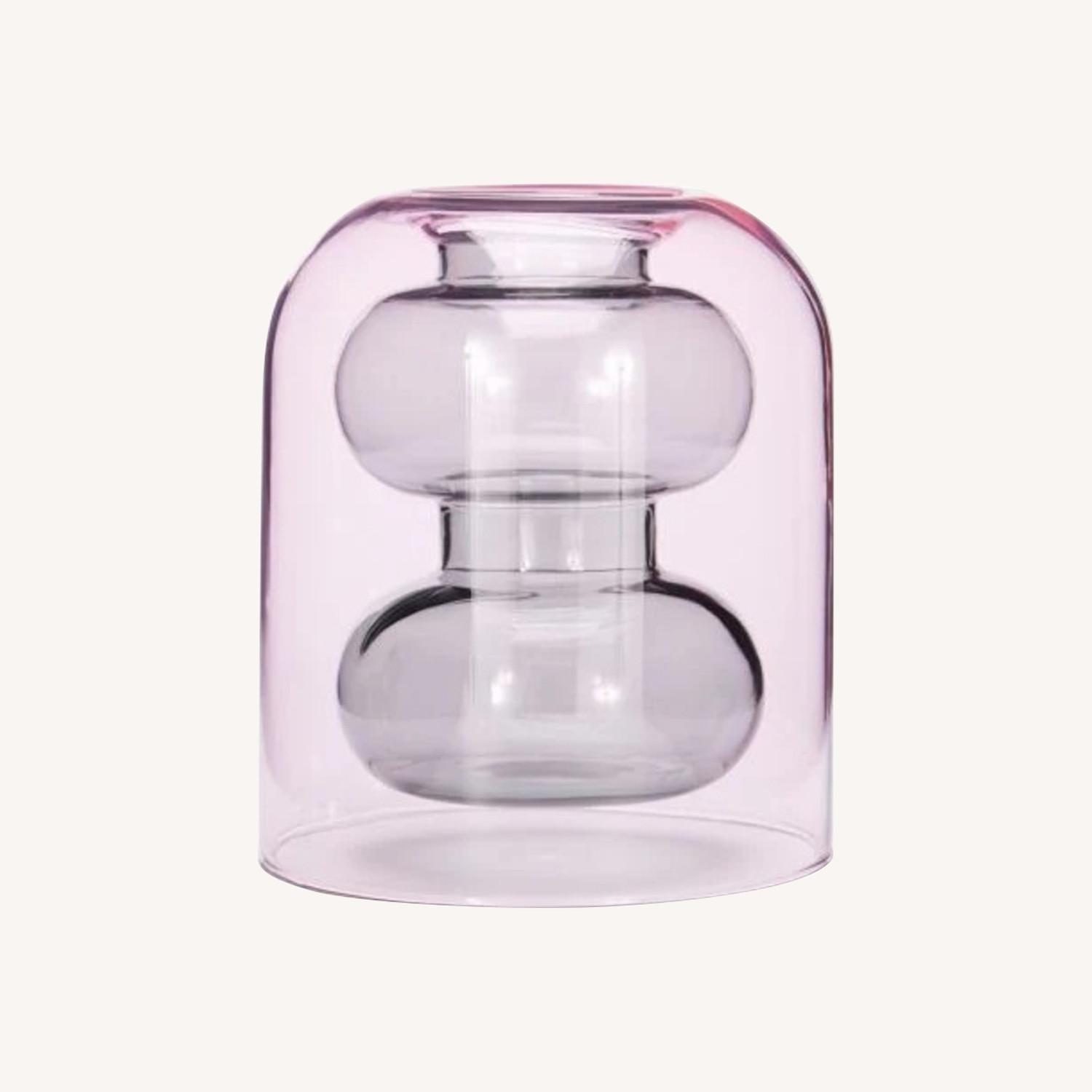 Seller's Notes:Pink glass with black interior. All glass transparent. Beautiful with or without flowers.