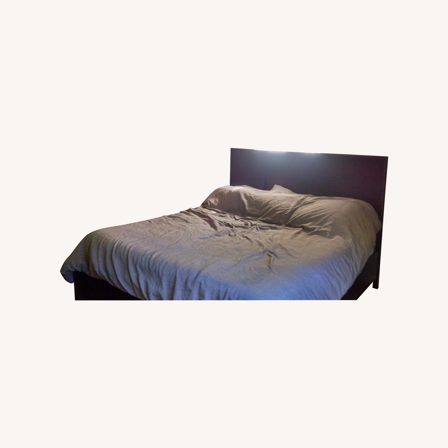 Seller's Notes:Dark Espresso Wood California King Bed with two drawers at the foot of the bed. No box spring needed. We reinforced wood slats.
