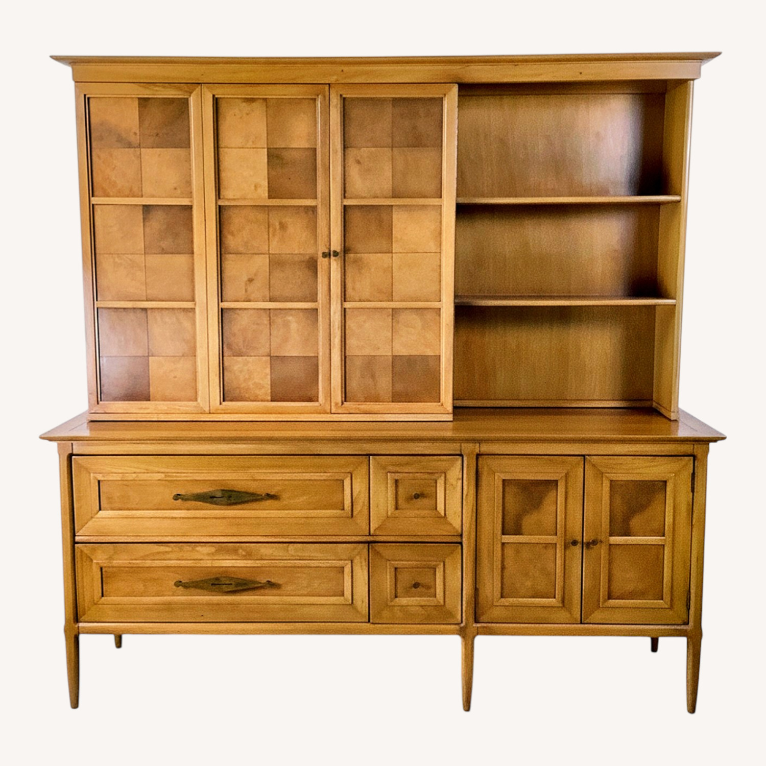 Seller's Notes:This mid-century modern hutch from Tomlinson’s Sophisticate line combines clean architectural lines with distinctive veneer panel detailing. The upper cabinet includes glass-front doors with checkerboard veneer panels and open shelving for display. The lower section offers spacious drawers and cabinet storage, making the piece practical for dining or living spaces. Tapered legs and framed panel construction reinforce the refined mid-century aesthetic. A versatile storage and display piece with strong presence. Dimensions: 75.75w 19.5d 75h Condition: age appropriate wear, finish loss, scuffs/scratches, edge wear, discoloration,interior marks, see photos.