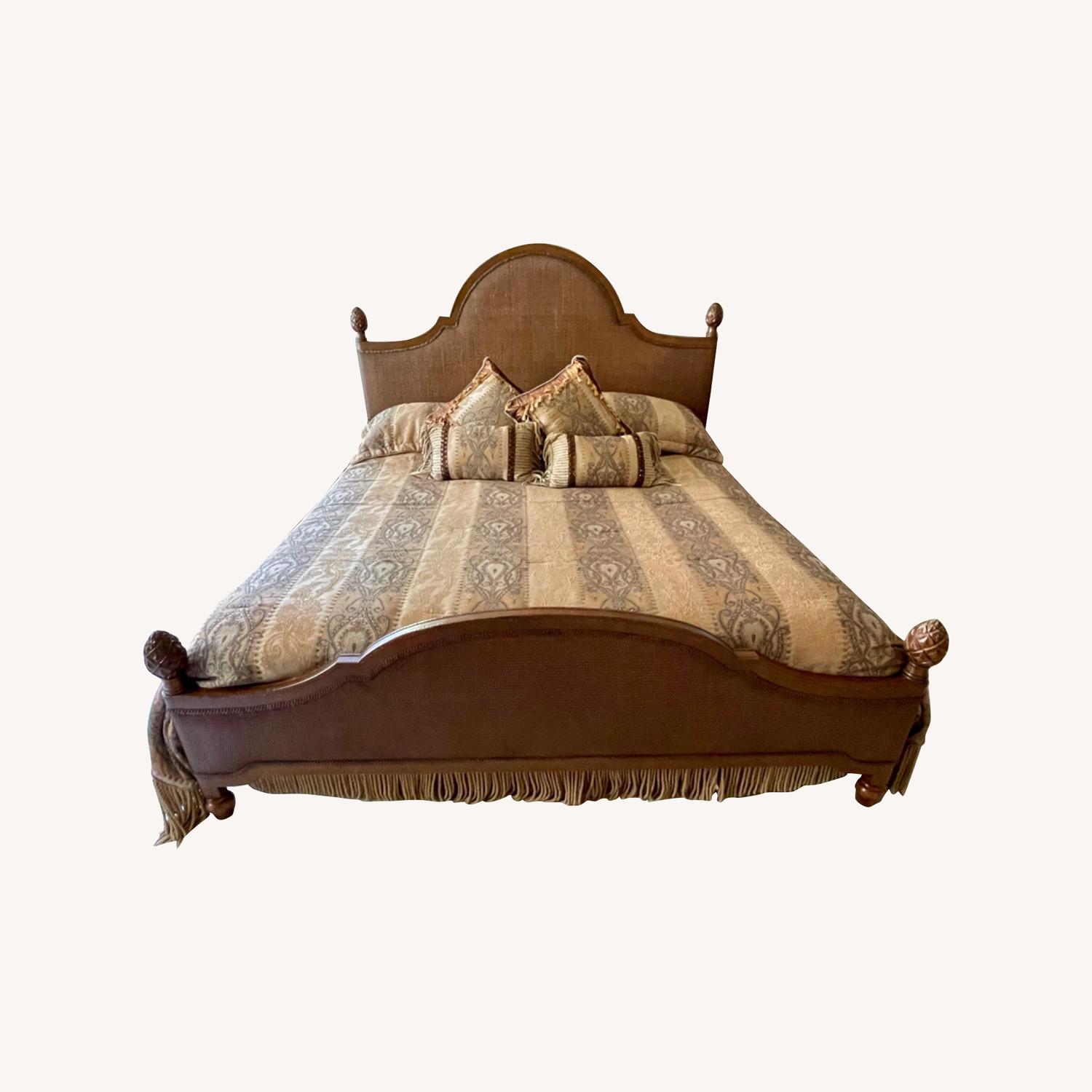 Seller's Notes:Tommy Bahama Designer King Bed Frame by Lexington King size bed frame by Tommy Bahama furniture collection (Pineapple design) - includes bedding set and 5 Tommy Bahama pillows! Darker brown wood with 4 pineapple finials on each corner. Headboard and foot board are woven rattan. Everything in near perfect condition! Very solid and high quality. Excellent condition with very light wear from age and use. If you know this brand, then you know how well-made it is and how much it costs new. Mattress and box spring are included, if you like. Memory foam king size mattress in clean and nice shape. Bed frame: assembled 88” length x 82” wide x 65” high Headboard: 82"W x 65"H x 3"D Footboard: 82"W x 28.75"H x 3"D Rails (2): 82"L Slats and center supports are also included. Smoke-free and pet-free home.