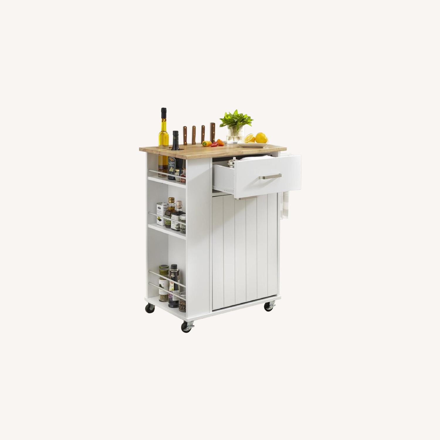 Seller's Notes:No longer fits in my kitchen but I bought this at Wayfair and had it built by a professional ($100+ value). The piece is currently out of stock and won't be back until August. You also don't have to worry about putting it together which took the professional over an hour to do. The island cart was only bought a month and a half ago. Features below: Features: - Beadboard faced pull-out trash bin (liner not included) - Champagne finished accents - Four rolling casters (2 locking) - One storage drawer for kitchen essentials - Three tiered spice rack and towel bar - Wheels included - Can accommodate an 8-gallon trash bin
