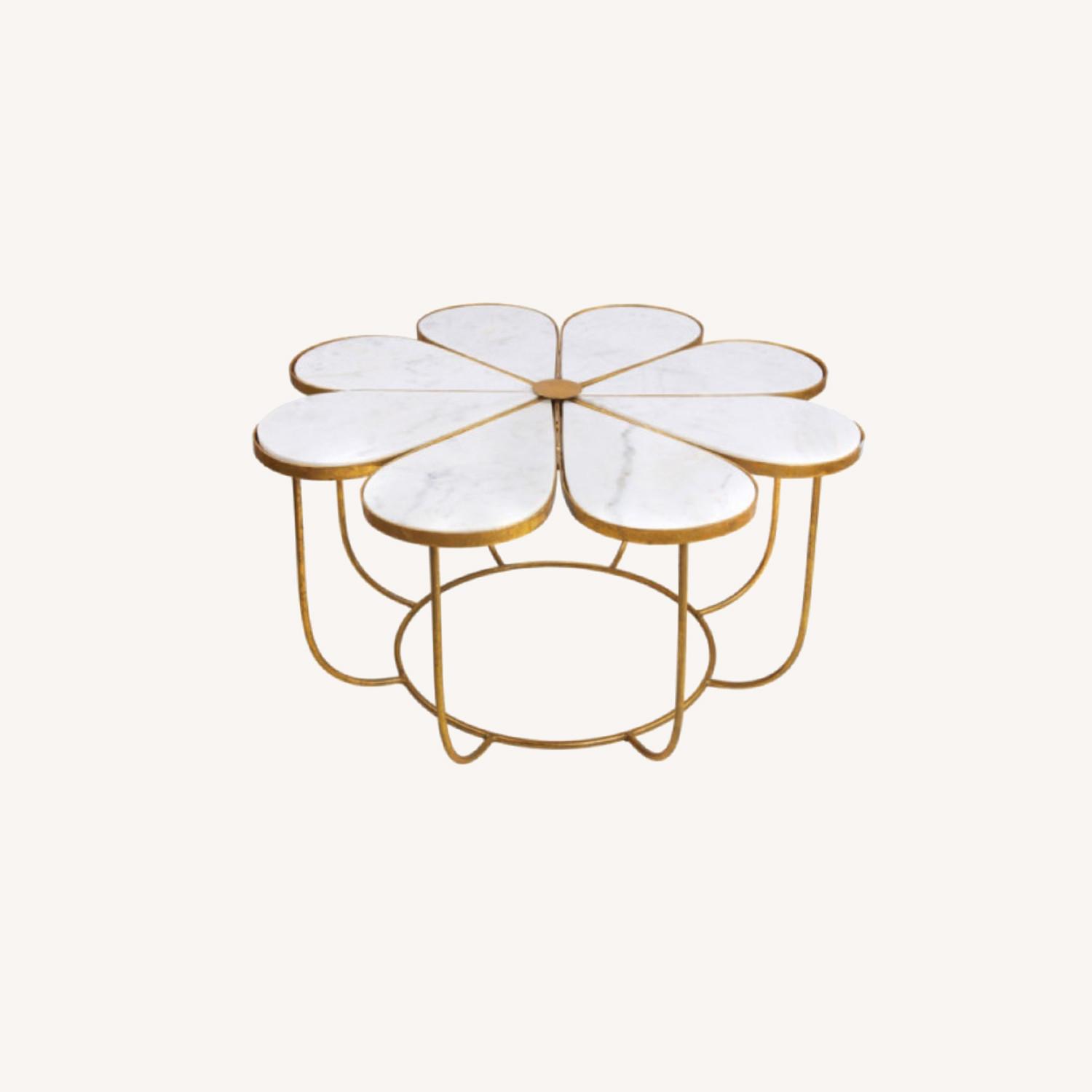 Seller's Notes:Glam design and botanical style. The flower cocktail table boasts a polished white marble top, gold finish and the framework of its namesake. Enhance your space with this eye-catching piece. As this is a handmade product, slight variations are to be expected and may result in small gaps between the marble and frame. Completely Handmade by Master Artisans Polished White Marble Top Gold Finished Frame Botanical Style