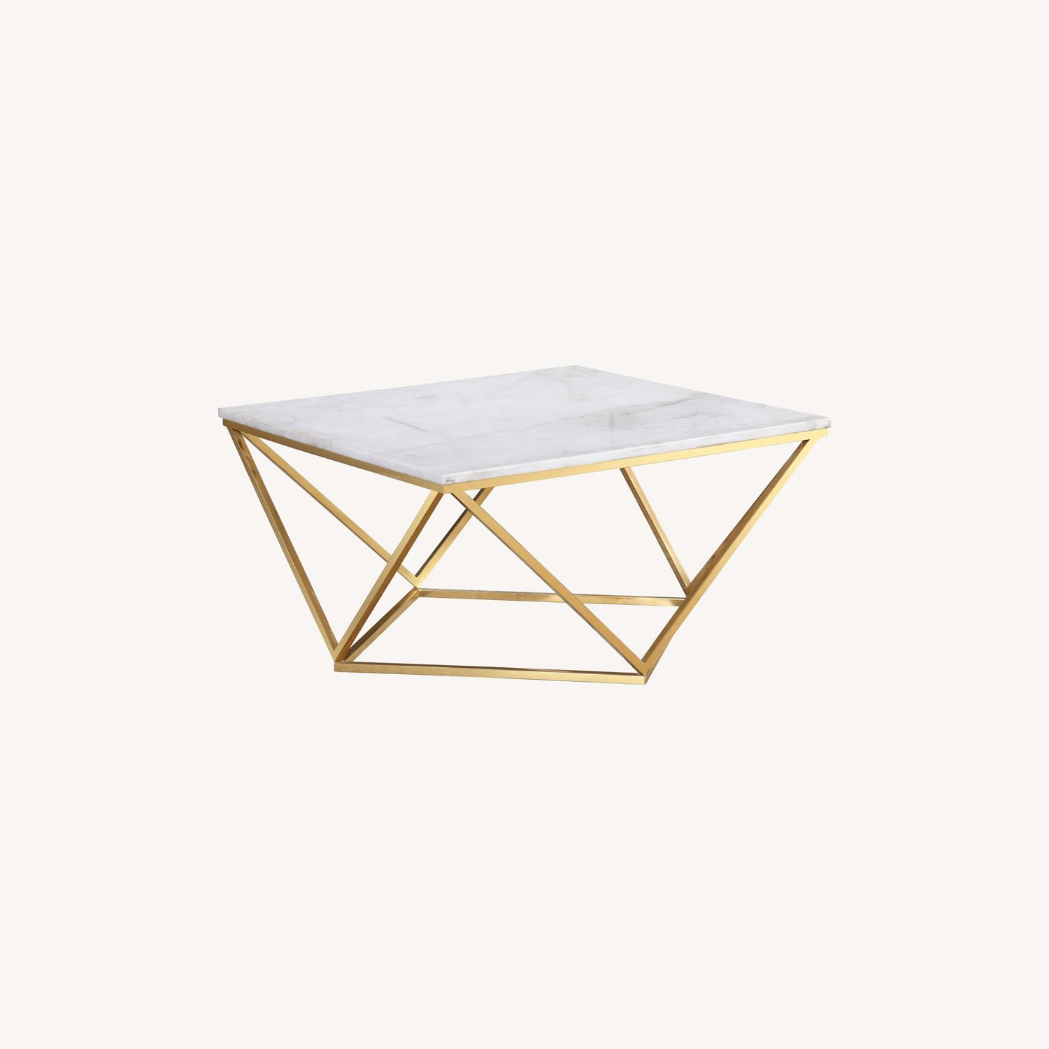 Seller's Notes:Modern with an organic twist, this eye-catching design shows off an elevated white marble top elegantly anchored to a gleaming gold steel base. Brimming with luxury and refinement this side table is sure to be a standout piece. Features: Handmade by skilled furniture craftsmenReal white marble topGold steel base features impressive frameworkMatching side table available Minor Assembly required