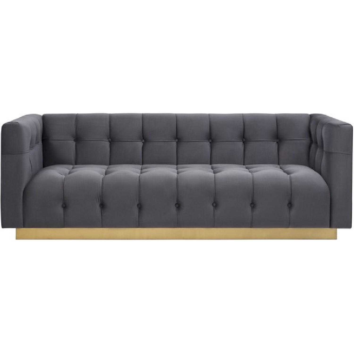 Seller's Notes:Offering a fresh and modern style this sofa features a glimmering gold base, sumptuous upholstery, and elegant button tufts. Experience luxury with the handmade Roma sofa. Available in a crisp navy and deep grey velvet.SHIPPING TIME FOR THIS ITEM IS 2-4 WEEKS
