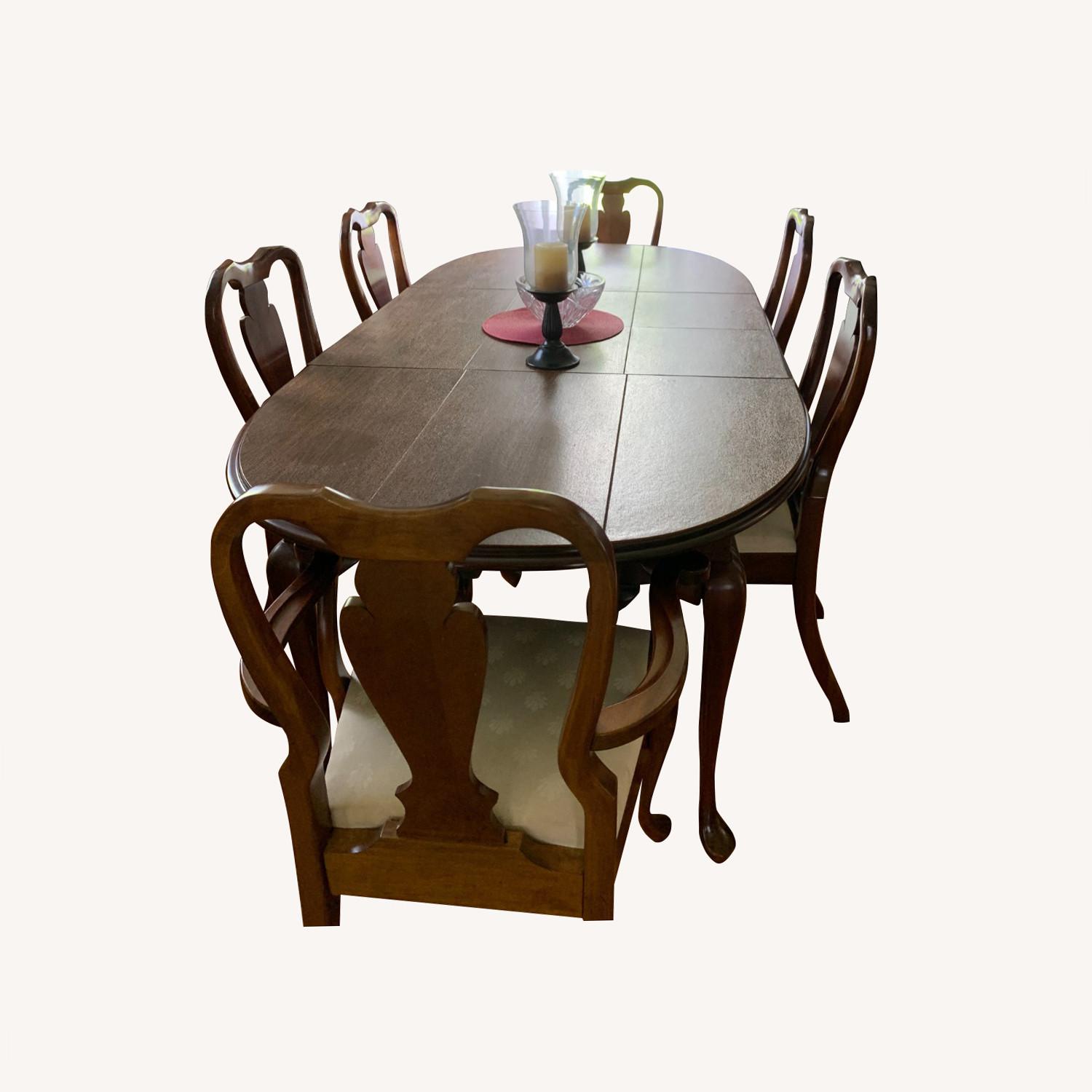 Wear and tear details: This traditional Queen Anne style dining set comes with 6 chairs, but can seat 8 with the two leaves. The chair upholstery is clean., Included is a custom table pad to keep from having to use hot pads etc.