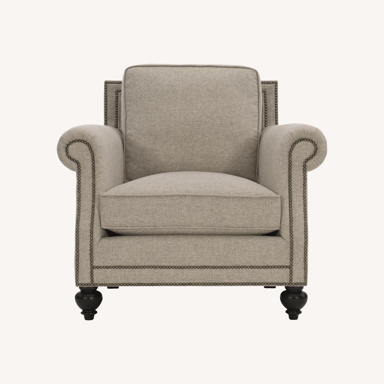 Dress up your room with our Brae furniture line. The thickly padded arms and soft seat and back cushions found in all Brae furniture are brought to a more compact single-seat option. Wide, rounded arms are accentuated by the linear frame ornamented by rich wood legs and nailhead trim for a refined look. Extend the beauty and comfort further with a matching ottoman.