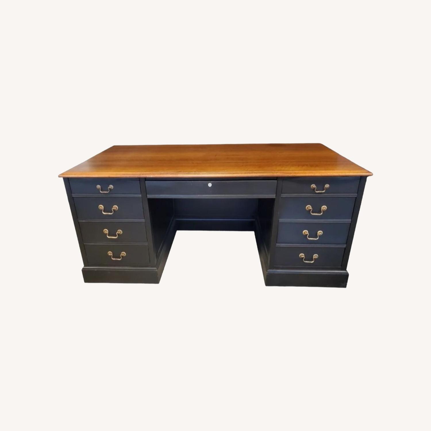 Seller's Notes:The 1981 traditional Jasper Executive Office Desk and Credenza Set is a classic representation of high-quality craftsmanship and timeless design, characteristic of Jasper Cabinet Company’s furniture from that era. Here is a detailed Description: Executive Desk:Material: Solid wood construction with fine veneers, likely oak, walnut, or cherry, providing durability and a rich, elegant finish. Design: Traditional style featuring intricate woodwork with carved details and moldings, reflecting a refined and professional aesthetic. Surface: Spacious desktop with a polished finish, possibly accented with a leather writing pad inset, designed to offer a smooth writing surface and enhance the desk's luxury appeal. Drawers: Multiple drawers for organization, typically including: Pedestal Drawers: Two sets of pedestal drawers on either side, each containing three drawers of varying depths.Center Drawer: A central drawer often equipped with a lock and possibly a flip-down front to double as a keyboard tray.File Drawers: Lower drawers in the pedestals designed to accommodate hanging files, providing ample storage for documents.Hardware: Brass or antique brass hardware, including handles and drawer pulls, which add a sophisticated touch to the overall design.Credenza:Material: Matching solid wood and veneer construction to complement the desk.Design: Coordinated traditional style, with similar carved details and moldings as the desk.Surface: Expansive top surface suitable for additional workspace, display items, or office equipment.Storage: Versatile storage options, often including:Cabinets: Enclosed cabinets on either side with adjustable shelves inside, providing concealed storage for larger items.Drawers: Central drawers for additional office supplies and documents, typically featuring the same brass or antique brass hardware.Keyboard/Utility Drawer: A central drawer for keyboard or utility storage, maintaining a clutter-free workspace.