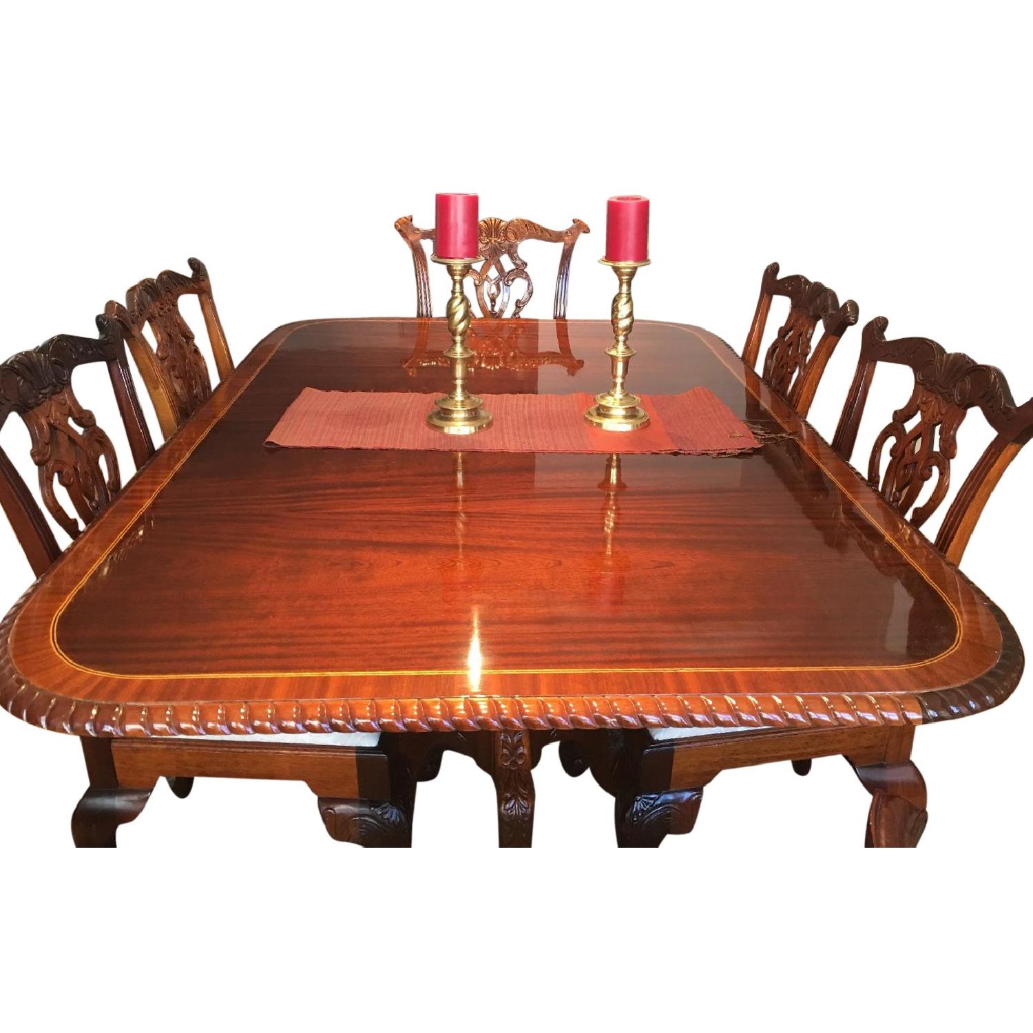 Seller's Notes:Traditional Queen Anne dining room set. Exquisitely carved solid hardwood. Table plus six chairs including two arm chairs and center leaf. The picture shows the table without the center leaf. Has been lovingly cared for and is in excellent condition, (W48” X H30” XL72”, L96” with leaf.) Seat cushions are in excellent condition but covering fabric needs cleaning. Retailed for around $7500. Purchased at Dcota Design Center in Ft. Lauderdale.