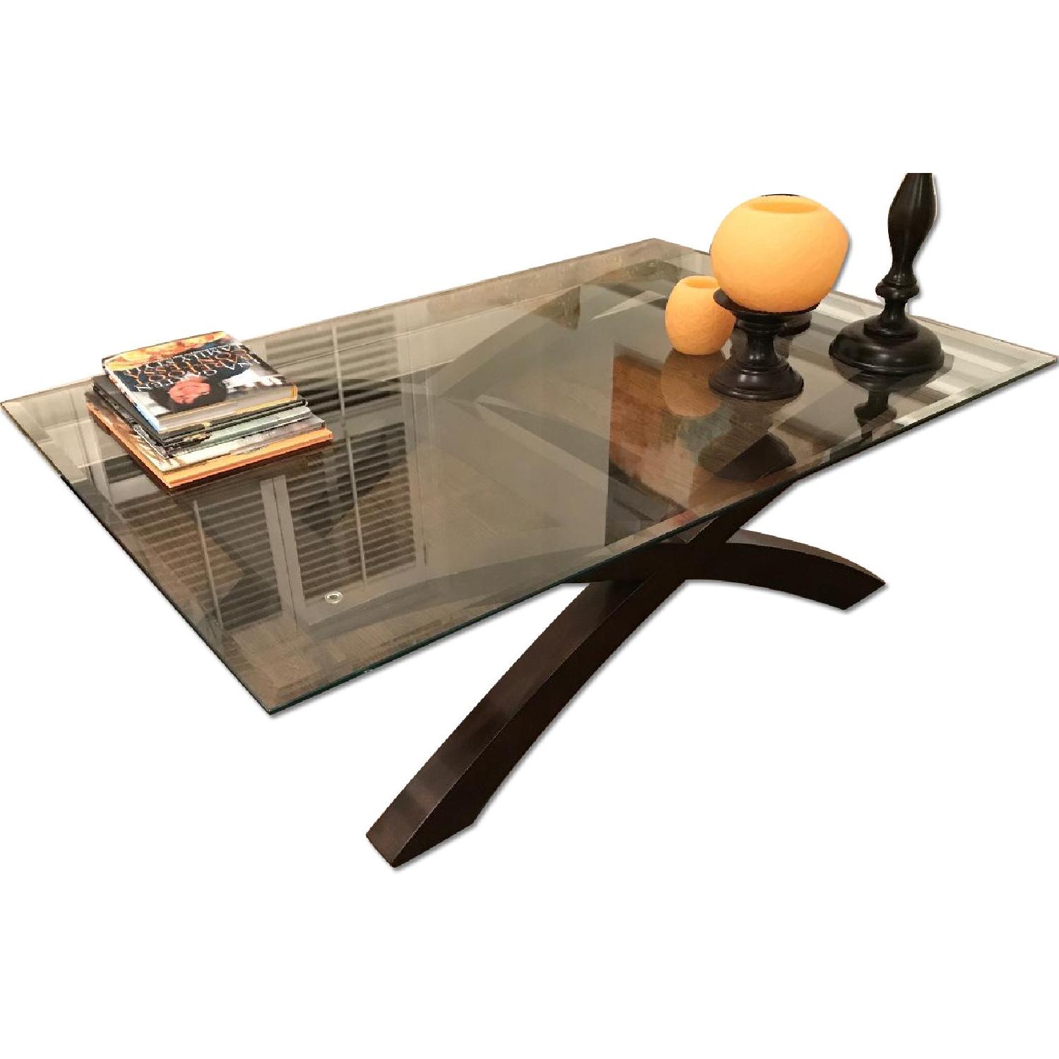 Seller's Notes:Beautiful glass coffee table with dark wood base. Glass top is beveled on the edges. Nice large size with a very transitional style. Very lightly used and in a smoke free and pet free home. Also comes with a matching end table. Coffee Table Dimensions: 54" long x 36" wide x 18" tall End Table Dimensions: 24" x 32" x 24" tall