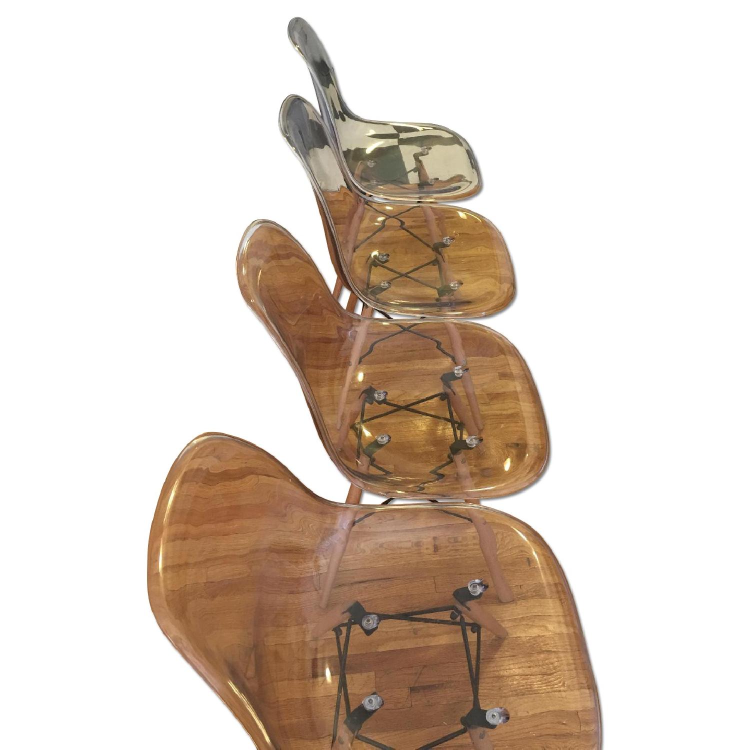 Seller's Notes:This set of four transparent Eames Eiffel replica chairs, with wooden legs and black metal frames, are perfect for any New York apartment. Because they are transparent, they have the illusion of not taking up much space, yet they look modern and comfortable. They are in a near-new condition, are easy to care for and are light in weight. I am selling them only because I am moving to San Francisco and do not want to take any furniture with me. Otherwise I would be keeping them because I love them!