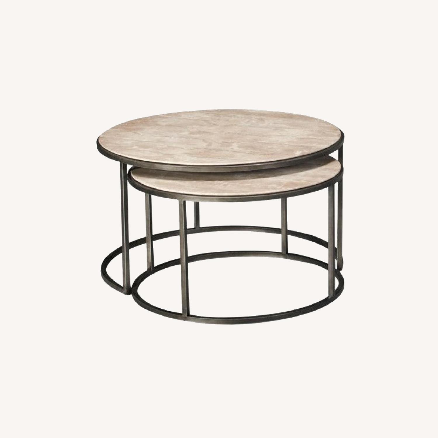 Seller's Notes:Very cool, stylish nesting coffee tables. Sturdy pewter finish metal legs and marble top. This is a solid piece of furniture you’ll enjoy for years.