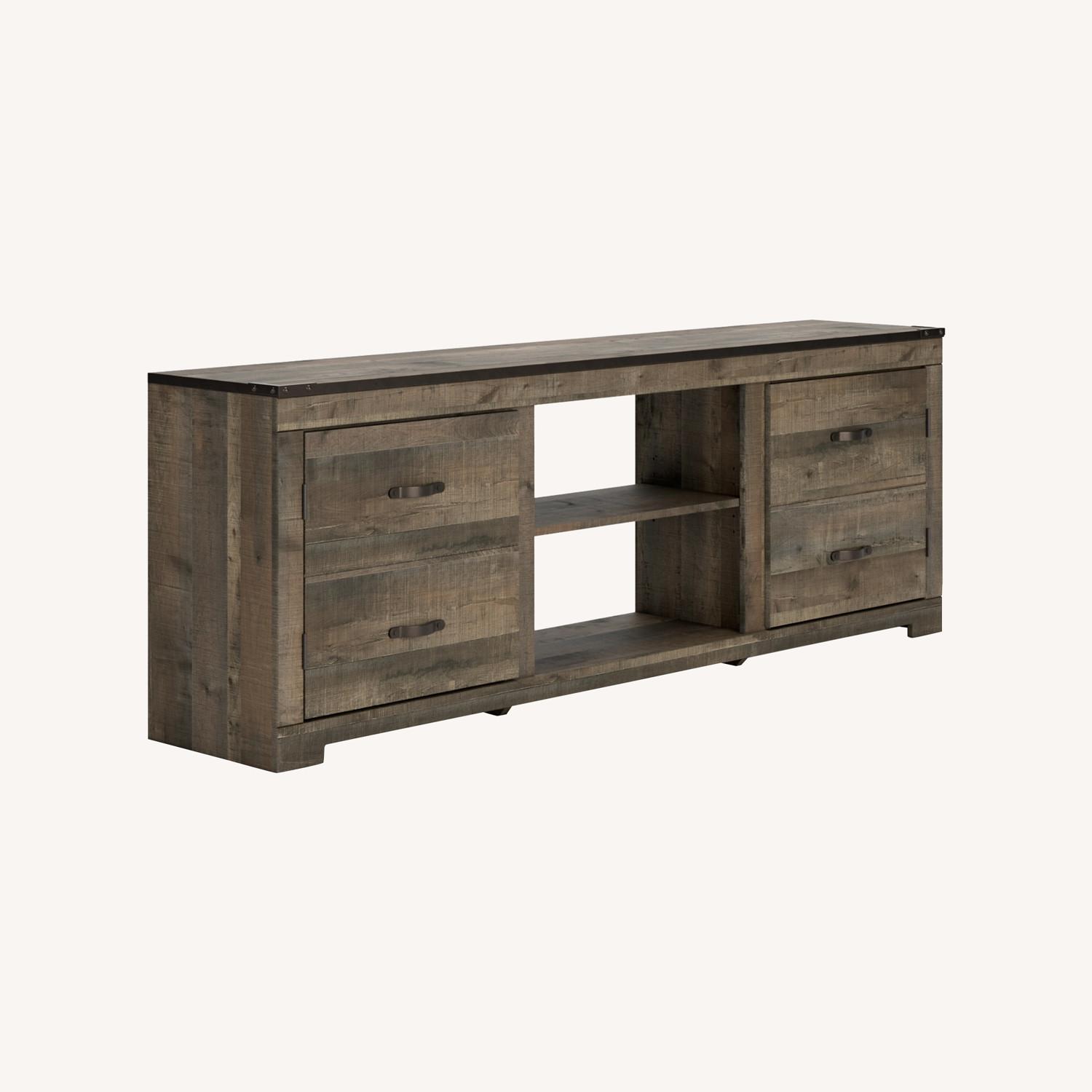 Seller's Notes:The Trinell large TV stand with fireplace option makes your home on the range look so alluring. The aesthetic is earthy yet clean and sophisticated, paying homage to reclaimed barn wood with a rustic finish, plank-style details and nailhead trim. Removing the shelf allows room for an optional electric fireplace insert, adding instant warmth and romance.