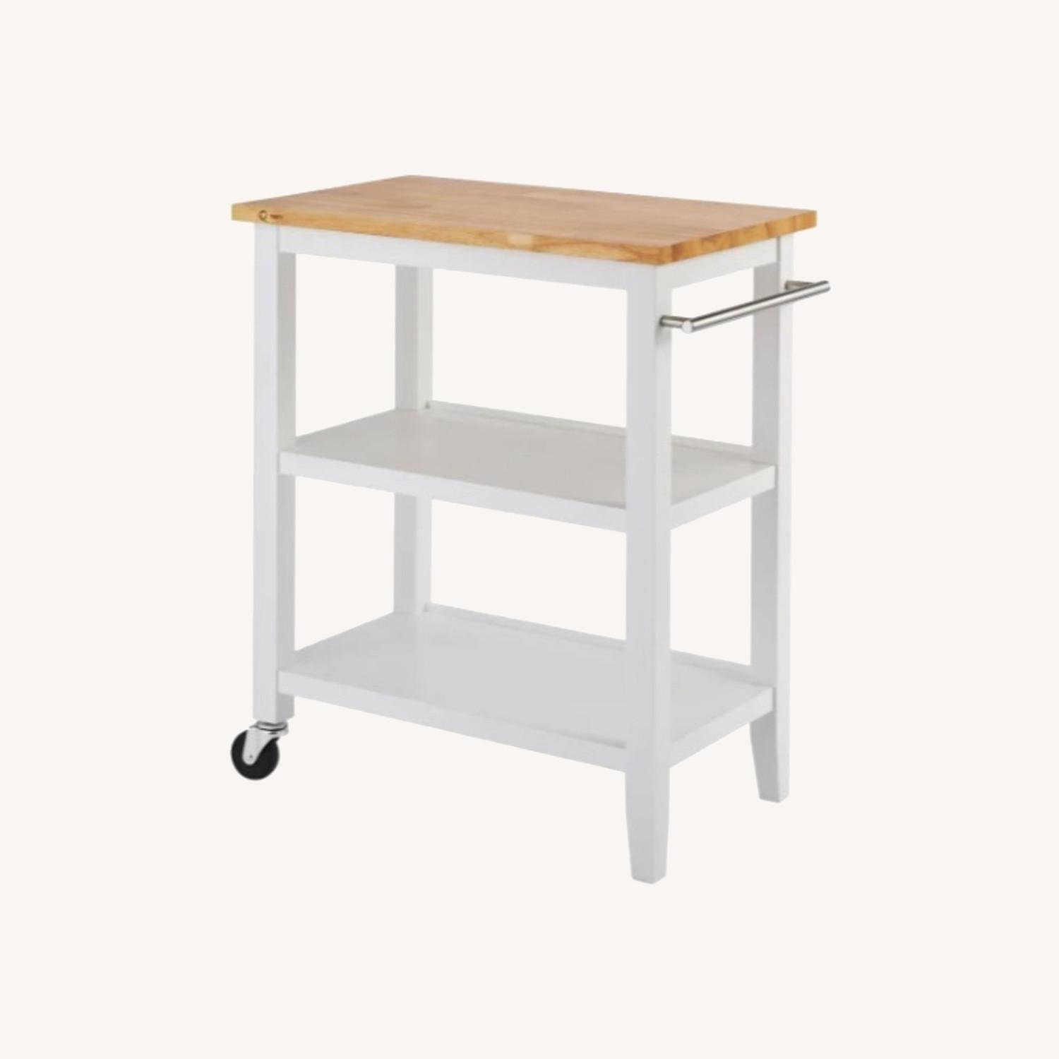 Seller's Notes:Features: Solid 1in Thick Rubberwood Top Stainless Steel Side Handle Doubles as a Towel Rod (2) - 24.5in W X 15in D Shelves Easy Mobility - 3in X 1in Swivel Wheels