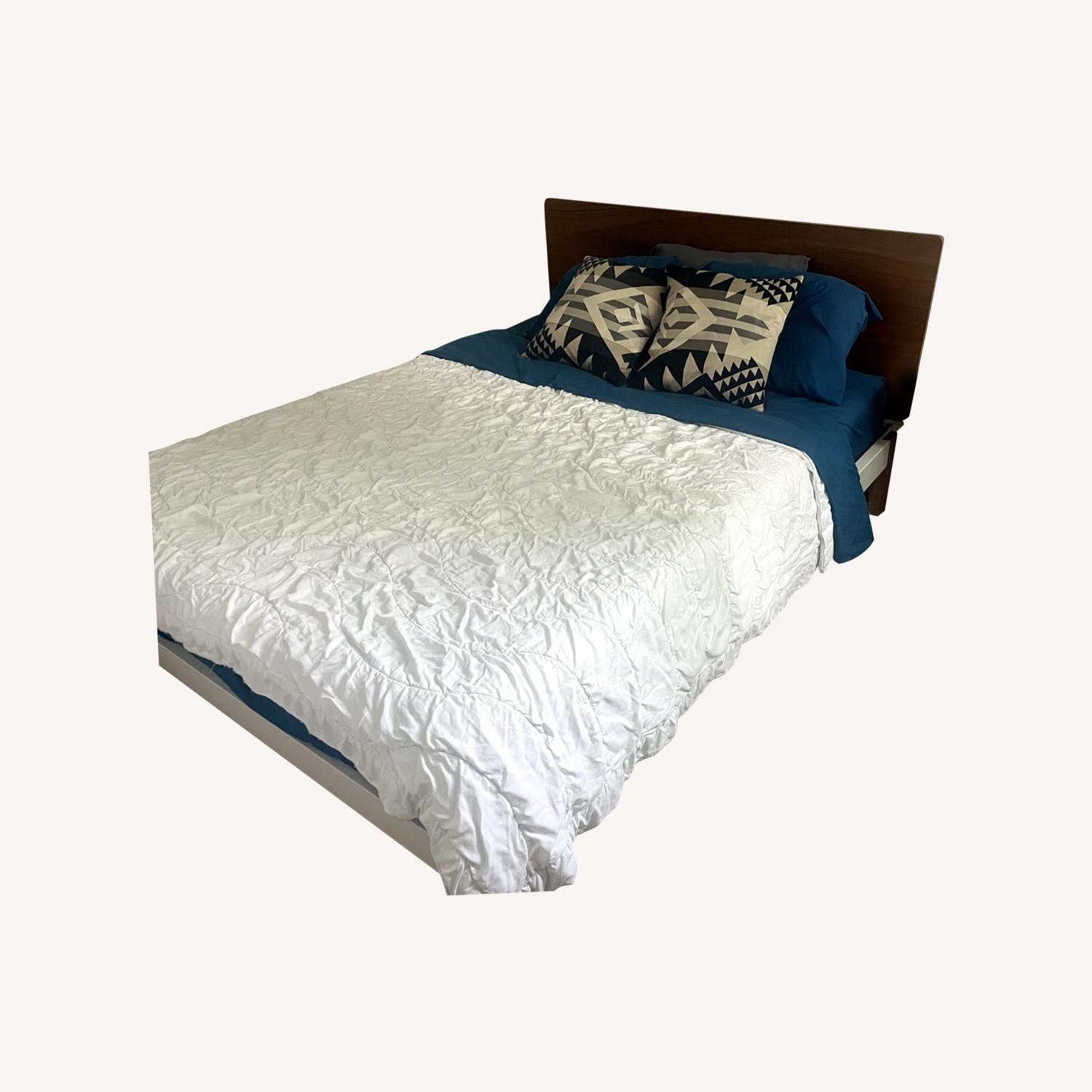 Seller's Notes:Sleekly designed bed frame with wood & metal combo Simple, clean design that works well in smaller spaces. This modern Tuft & Needle bed frame, featuring a sturdy metal platform base with wood slats—no box spring needed. It has a dark wood curved headboard (24” tall) that adds warmth and style, and unique wood legs inlaid into the metal frame for a high-end, streamlined look.