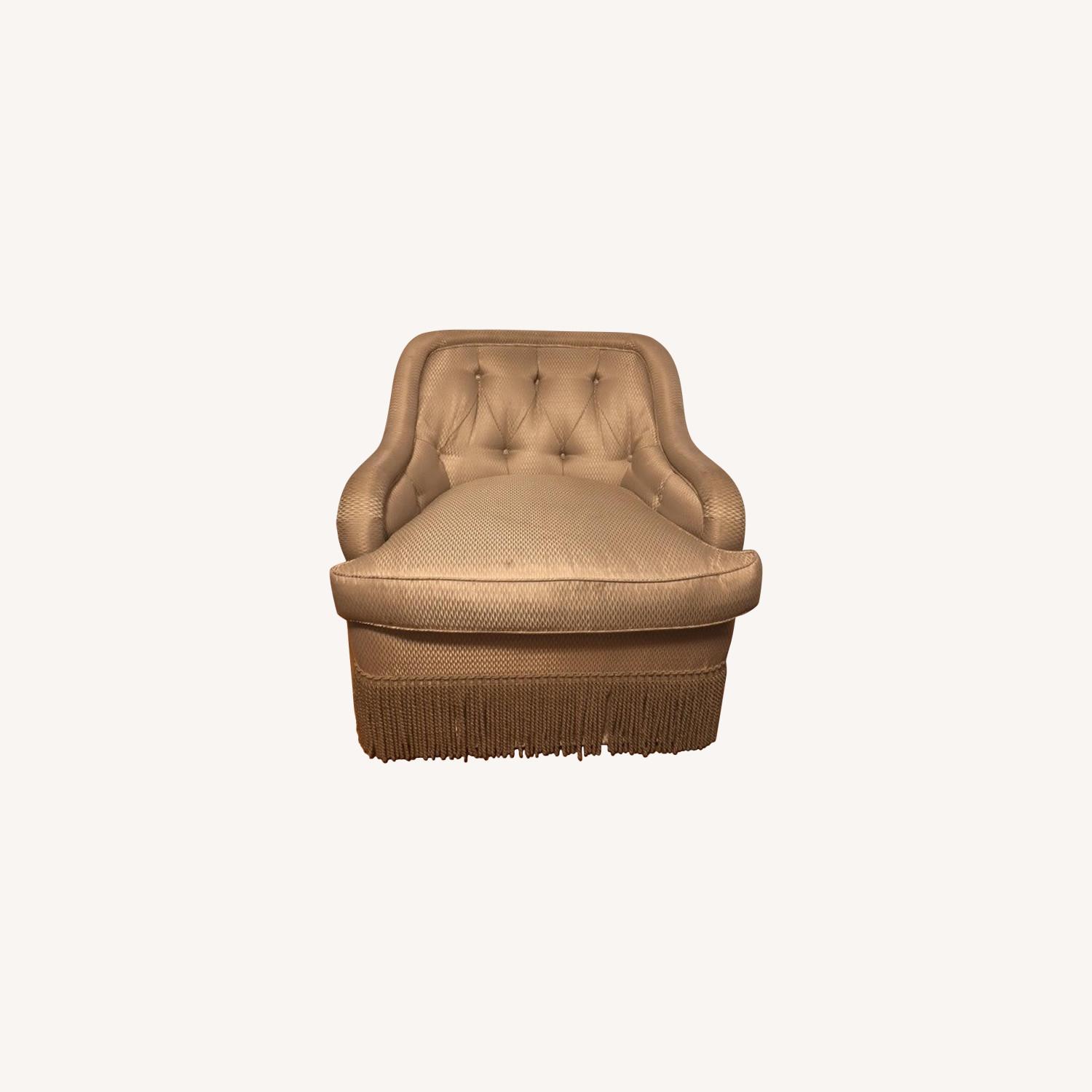 Seller's Notes:Armchair with Fringe Skirt and Seat Cushion. Sable Color with warm undertone. Seat Back is Tufted - Satin Jacquard Fabric - Not as much shine as appears in photo. Very Good Condition. There is a small light spot on reverse of seat cushion. Comfortable. Nice chair, but I no longer have space for it. 33" wide / 34" deep / 32" tall