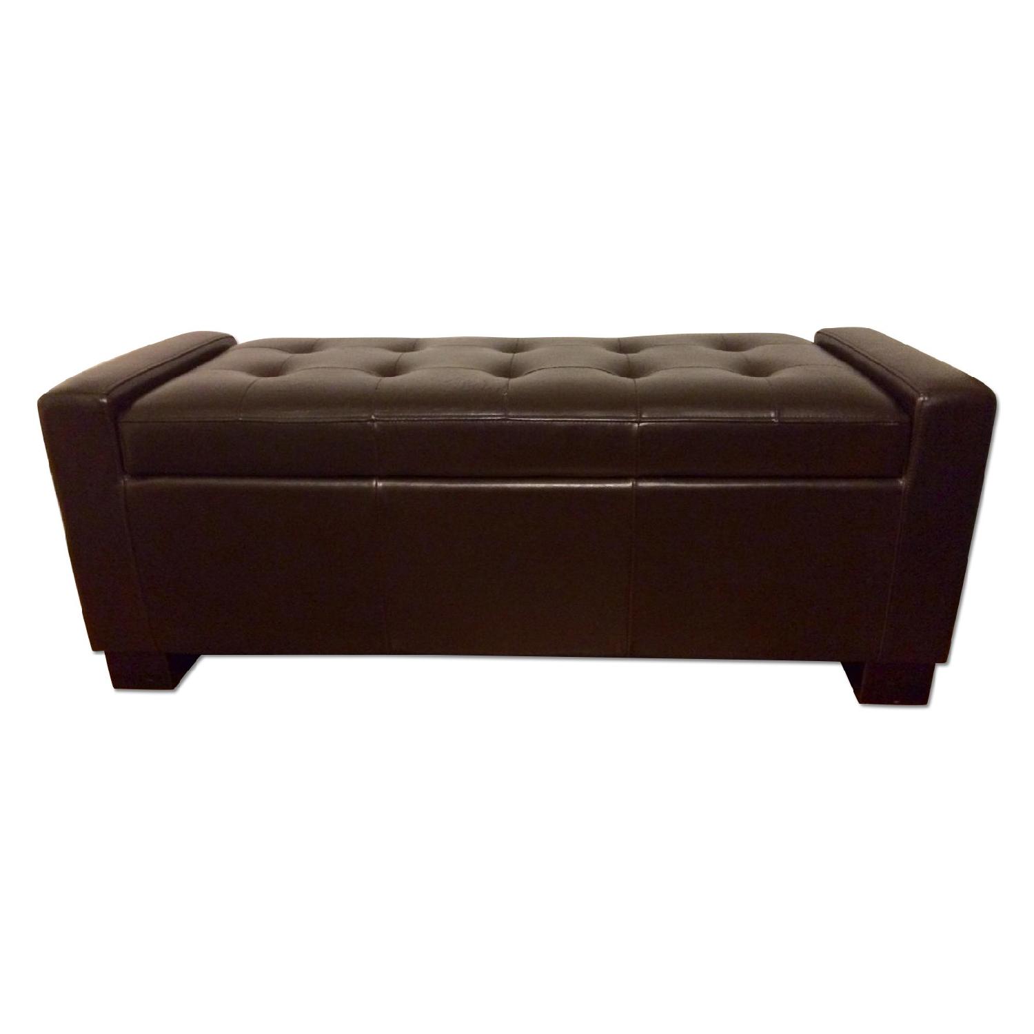 Seller's Notes:- Beautiful dark brown faux leather storage bench - Great storage for linens (including large blankets) and other items - Minor cracking on on top leather, smooth to the touch touch. Can be seen in close up.